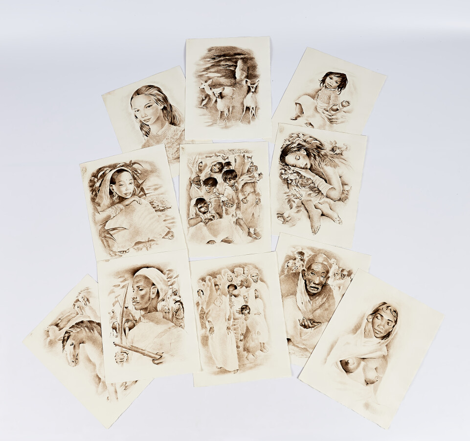 [EROTICA] - Ensemble de planches et suites érotiques, certaines très libres constitué de : 1 suite de 12 planches In-8° en feuilles gravées et rehaussées en couleurs attribuée à Grau Sala, 1 suite en feuilles de 18 planches In-4° en sépia de portraits de personnages d'Afrique du Nord dont des nus féminins, 1 suite de 16 planches érotiques In-4° en feuilles gravées avec remarques et rehaussées en couleurs dans le goût de Grau Sala sous chemise à rabats, ainsi que la même suite en noir, ensemble de 2 planches, dont 1 érotique en noir avec remarque et 1 en couleurs d'après Paul-Émile Bécat, sous chemise, 1 suite de 4 planches érotiques In-4° en feuilles gravées en 2 tons attribuée à Gaston Barret pour l'ouvrage Le Roman de Violette et 1 dessin original aux crayons de couleurs, nu féminin avec rehaut d'aquarelle sur 1 feuillet grand In-8°, sous chemise à rabat, attribué à Gus Bofa - Très bon état de l'ensemble, dans étui cartonné bordeaux.