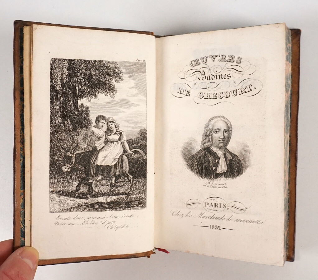 [EROTICA] - GRÉCOURT (Jean-Baptiste Willart de) - OEuvres badines - Paris ; Chez les Marchands de Nouveautés, 1832 - 1 volume In-12° - Frontispice gravé - Reliure de l'époque basane fauve marbrée (travaux de vers en bas des 2 mors avec perte de cuir au 2nd plat) - Dos lisse orné et titré or - Tranches marbrées.