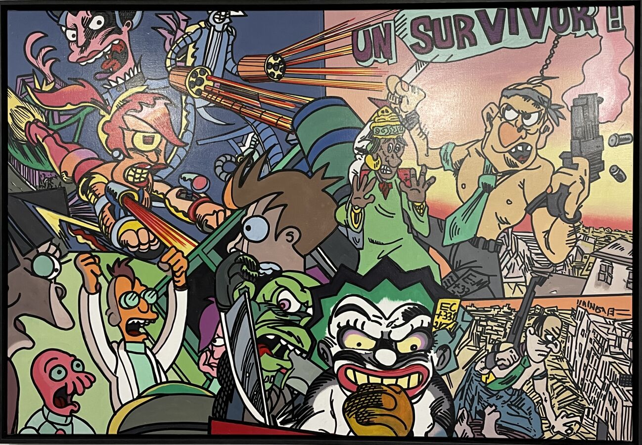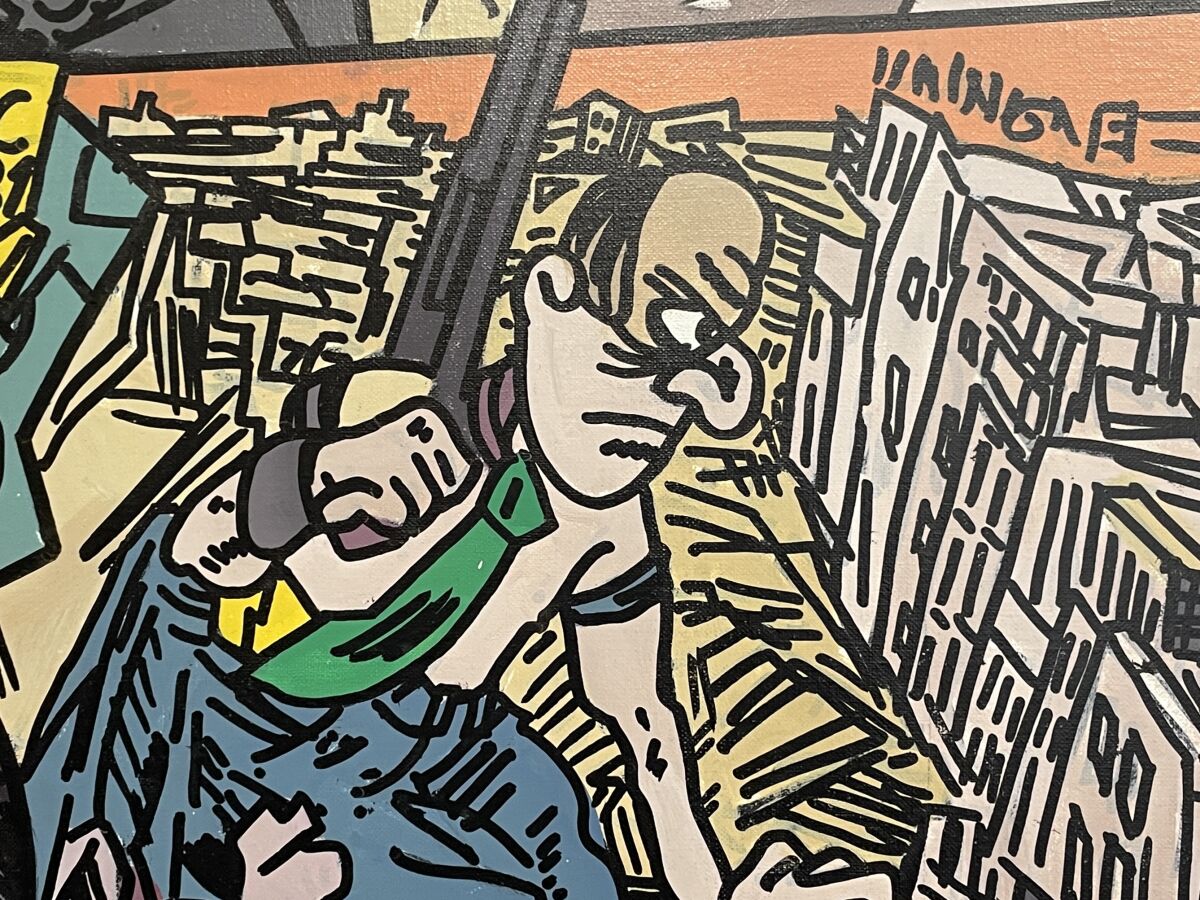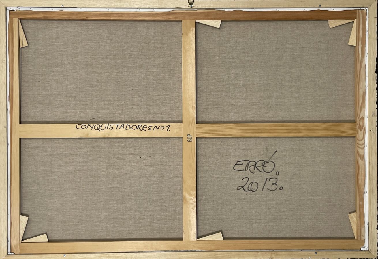 ERRÖ (1932), "Conquistadores", acrylique sur toile, signée au dos et titrée sur le chassis, 89 x 130 cm.