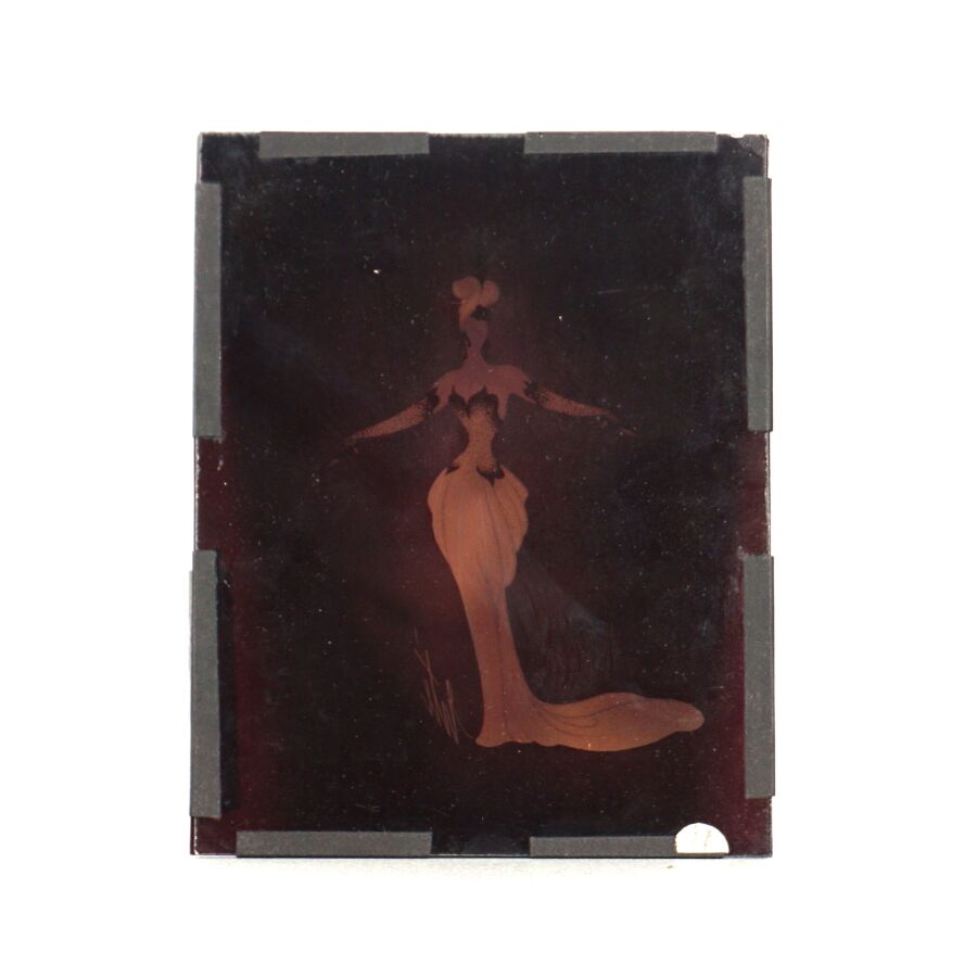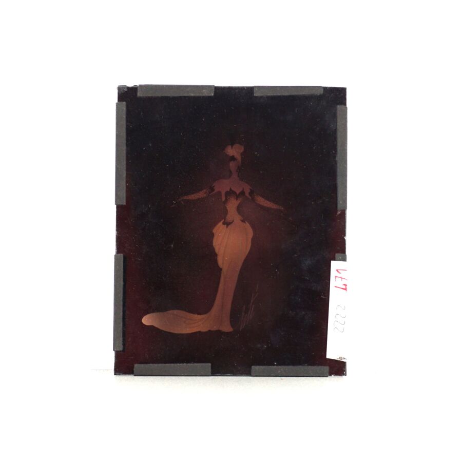 ERTÉ (Romain de Tirtoff, dit). Plaque de diapositive pour lantern, signée, représentant un costume pour les Folies Bergères, peut-être Hélène de Sparte, c. 1927-1930. Ex-libris collection Kilian Fritsch.
