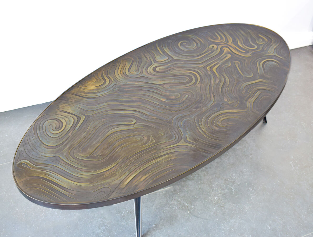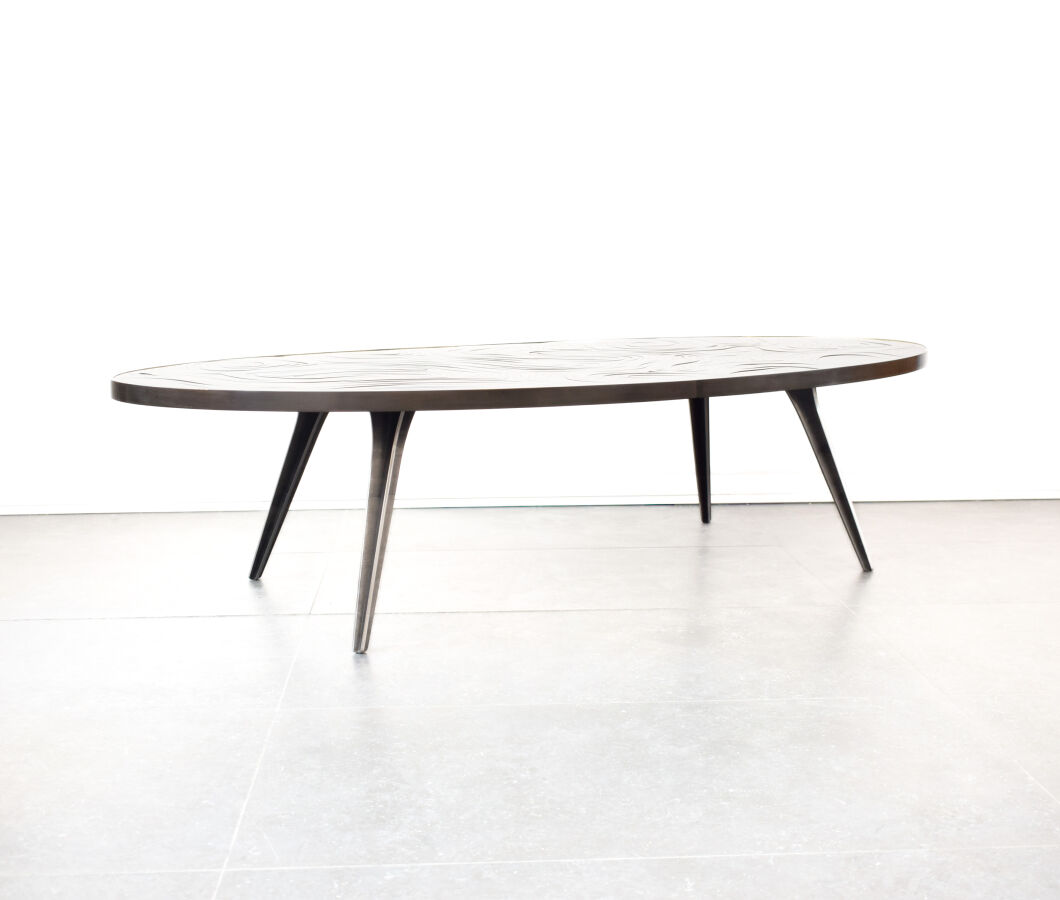 Erwan BOULLOUD (1973), Table basse "Ellipse", création sur mesure, à plateau ovale en marqueterie de laiton patiné reposant sur quatre pieds fuselés patinés noirs, 160 x 80 x 40 cm.