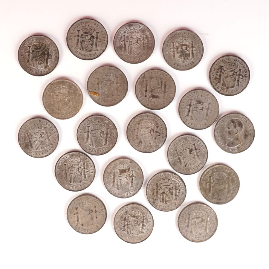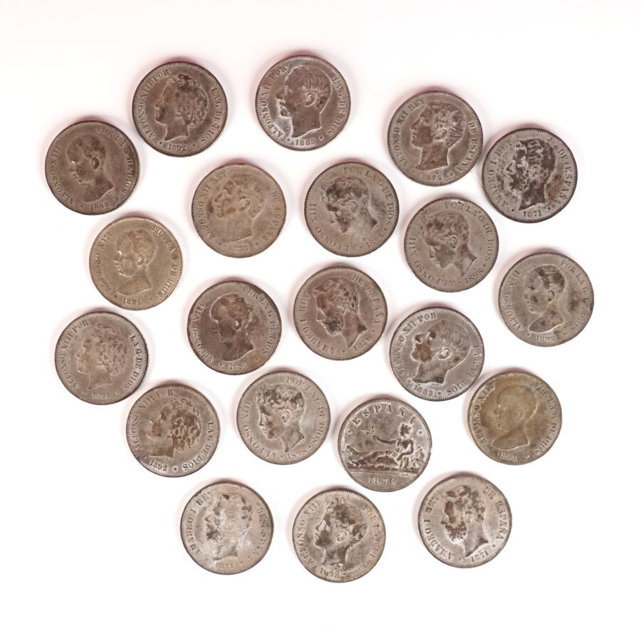 ESPAGNE : Lot de 21 x 5 Pesetas Argent gouvernement provisoire 1870, Amédé 1er, Alfonse XII et XIII (différents bustes de 1871 à 1898), Poids brut : 520 g environ.