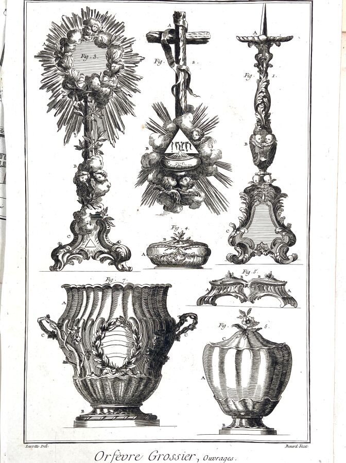 [ESTAMPES] - Ensemble d'environ 52 planches In-folio en feuilles (certaines sur double page) gravées en noir au XVIIIe siècle et tirées de l'Encyclopédie de Diderot et d'Alembert sur divers thèmes dont : Escrime (4), équitation (8), orfèvrerie (3), mosaïque (2), dessin (3), marine (2), anatomie (2), antiquités (3), ornithologie (2), architecture (9), art héraldique (7), … - Bel état.