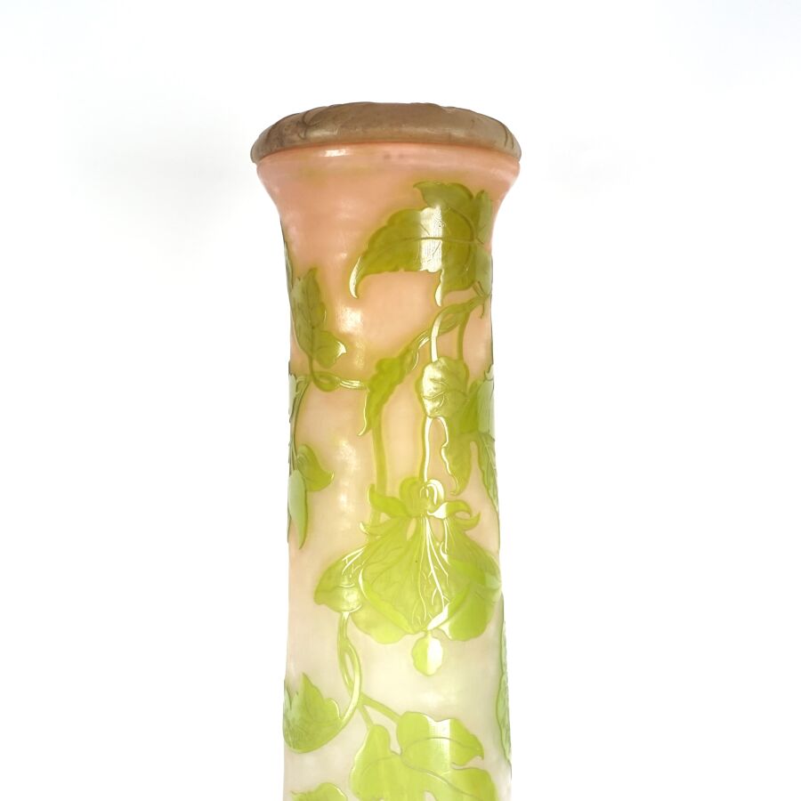 ETABLISSEMENT GALLE (1904-1936) : Important vase dit pied d'éléphant en verre soufflé multicouche à décor dégagé à l'acide de fleurs en vert sur fond beige - rosé, signature en camée sur le corps, avec son couvercle, H. 65 cm.