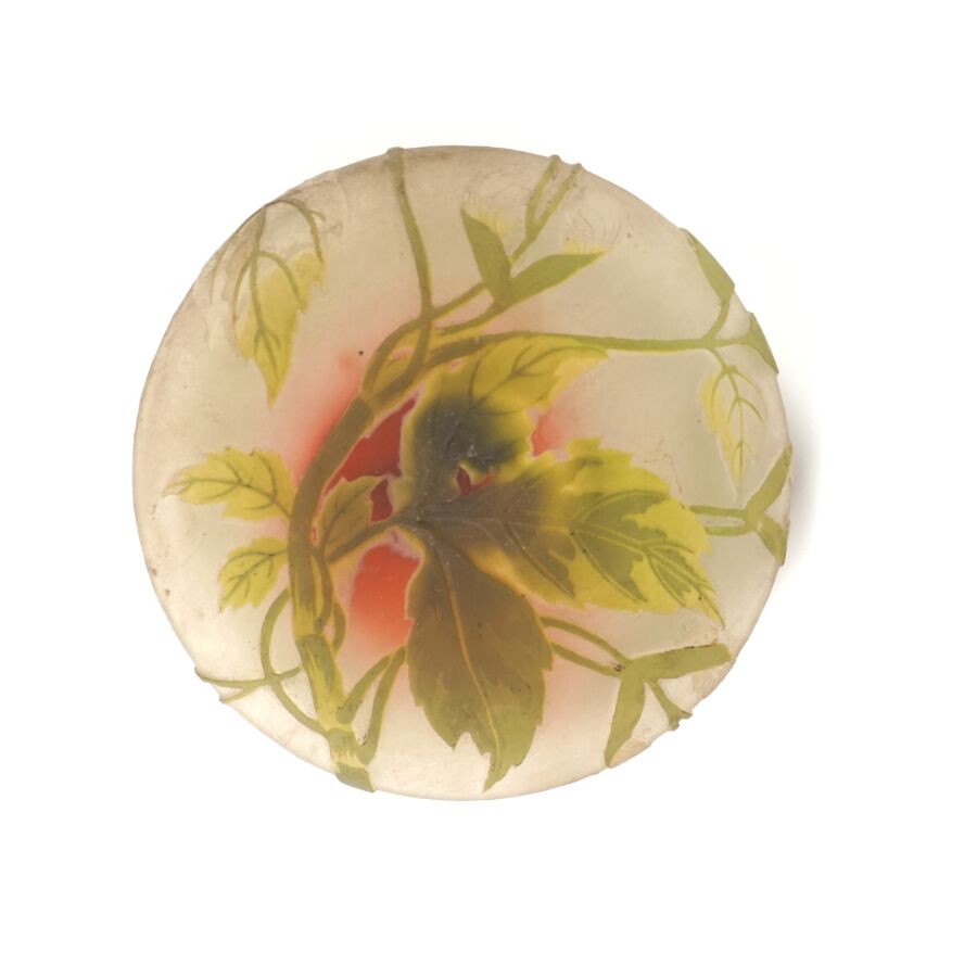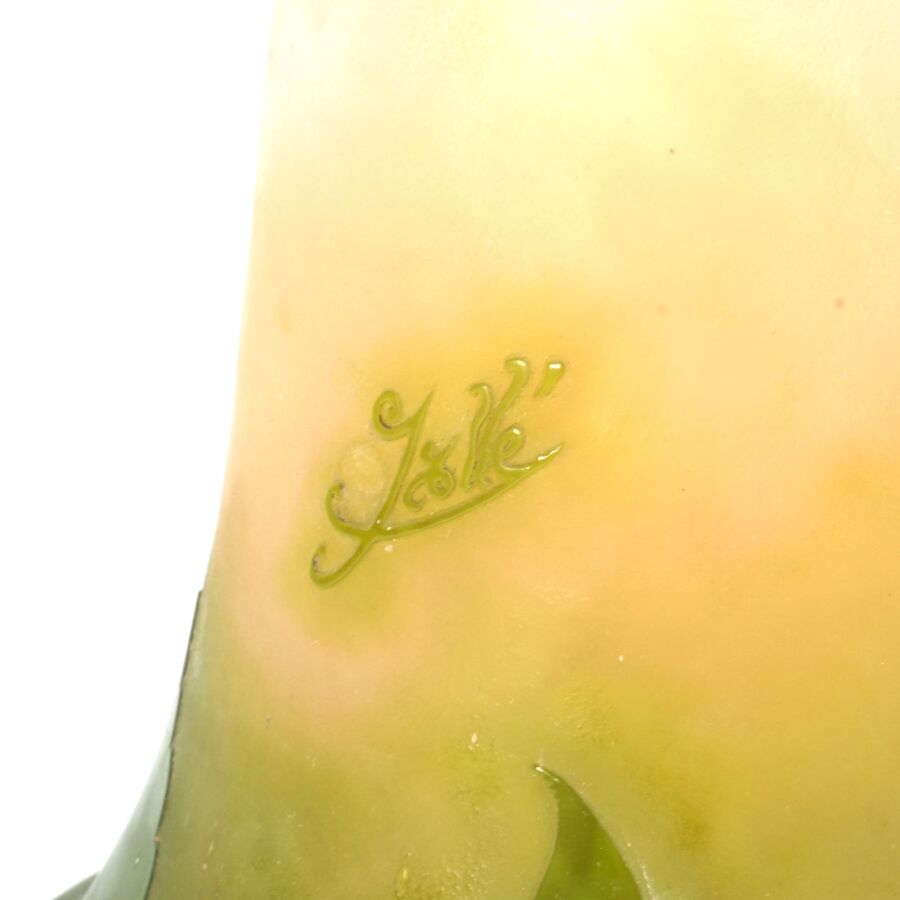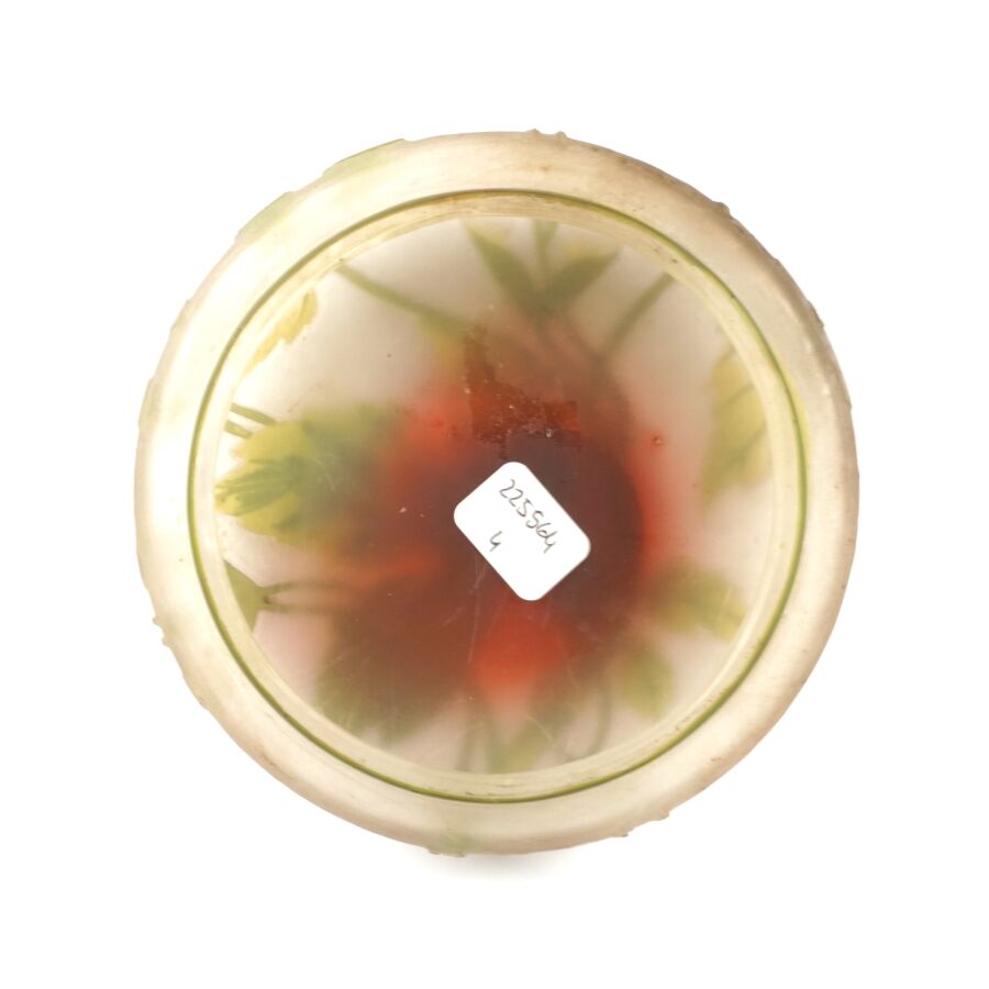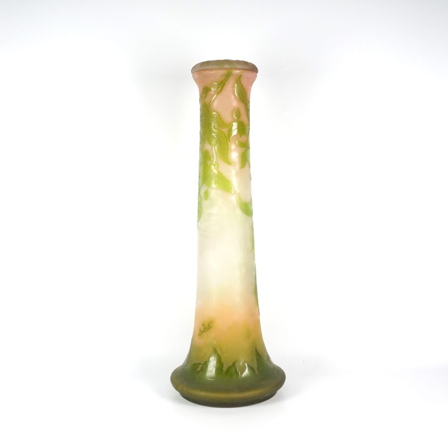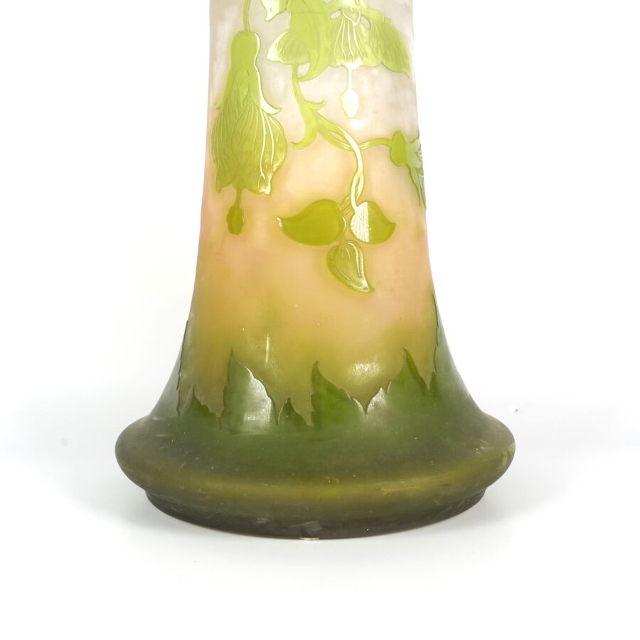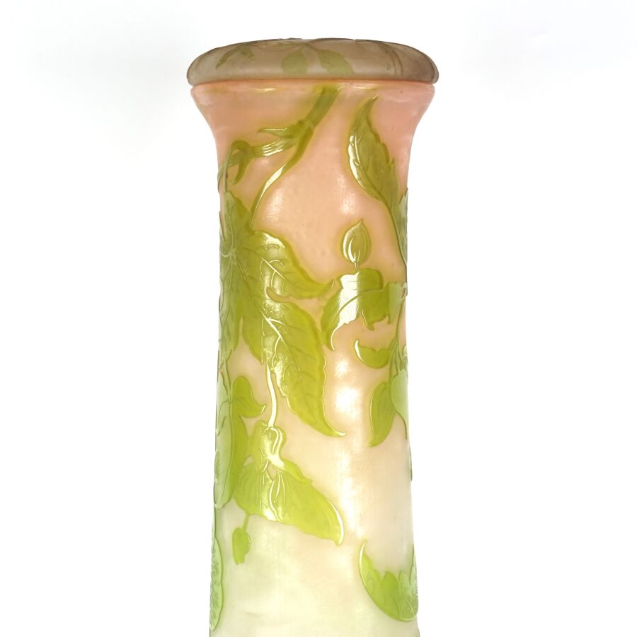 ETABLISSEMENT GALLE (1904-1936) : Important vase dit pied d'éléphant en verre soufflé multicouche à décor dégagé à l'acide de fleurs en vert sur fond beige - rosé, signature en camée sur le corps, avec son couvercle, H. 65 cm.