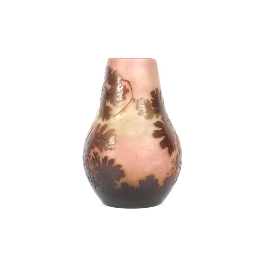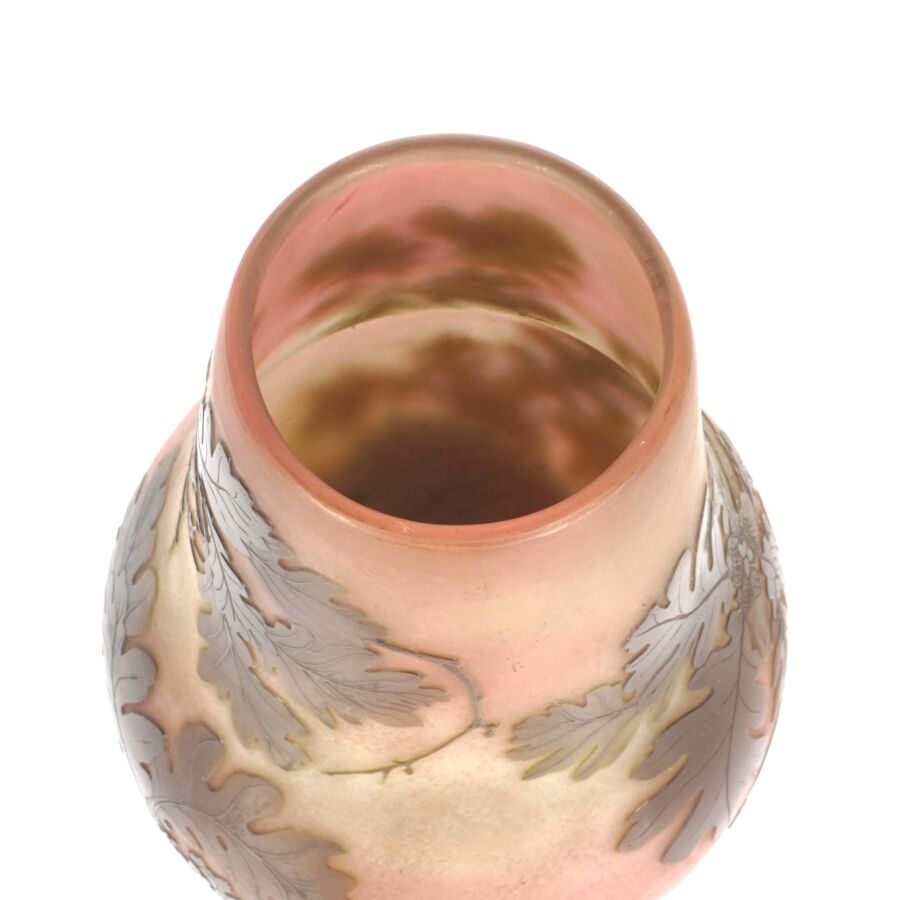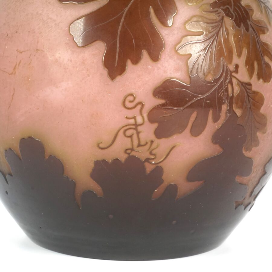 ETABLISSEMENT GALLE (1904-1936) : Vase de forme balustre en verre multicouches à décor dégagé à l'acide de ramures de chêne et glands en brun sur fond beige-bordeaux, signature en camée sur le corps, H. 22.5 cm.