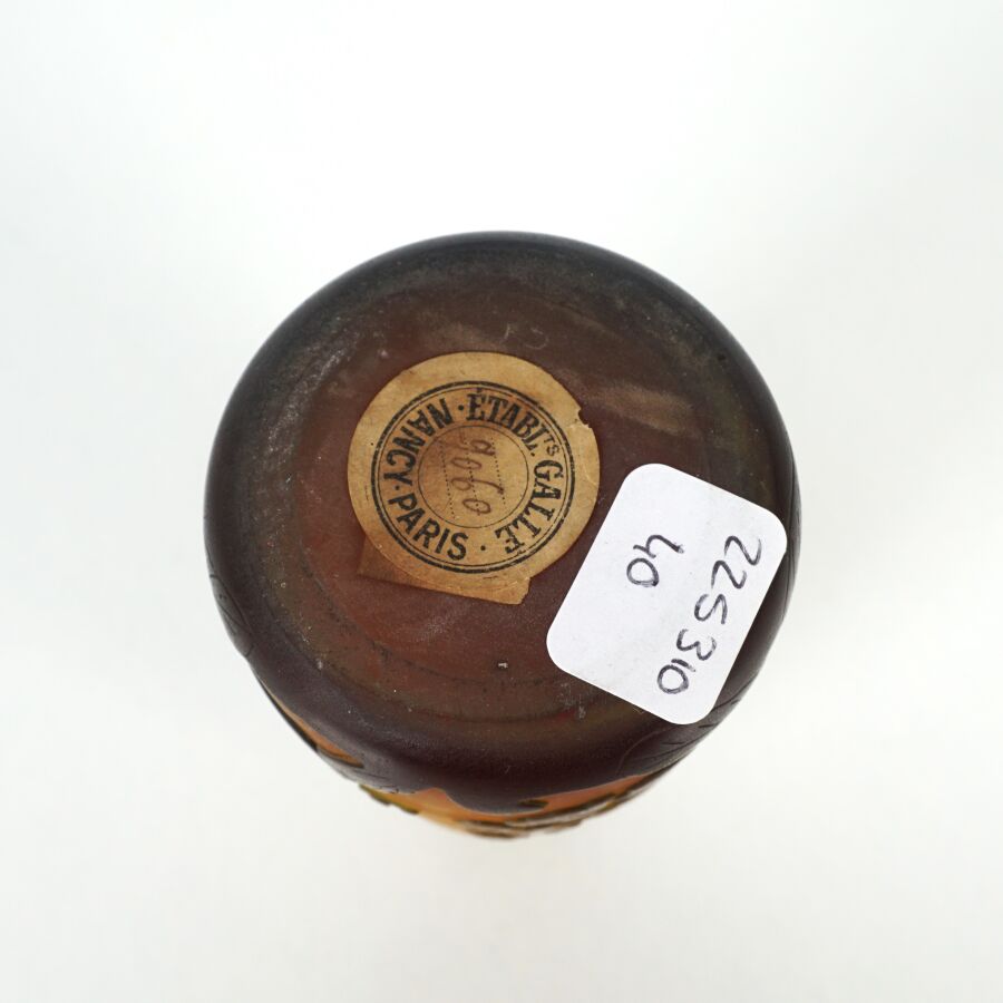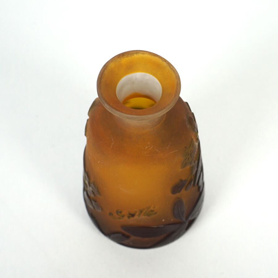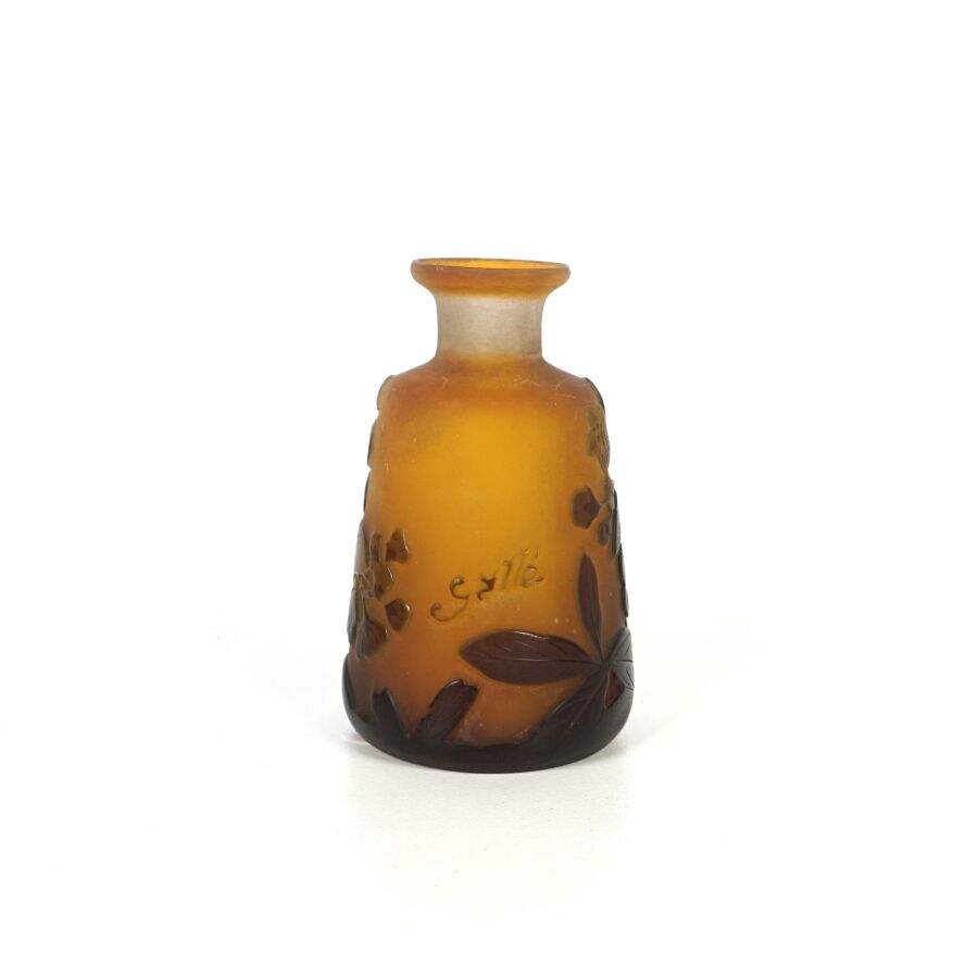 ÉTABLISSEMENT GALLÉ : Vase en verre soufflé à décor à l'acide de branches fleuries sur fond ocre jaune, signé, H. 9 cm.