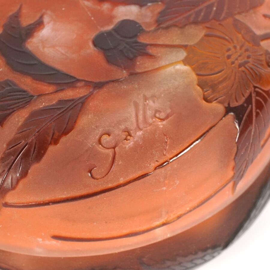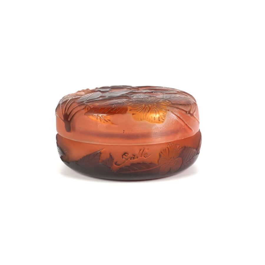 ÉTABLISSEMENTS GALLE (1904-1936) : Bonbonnière ronde en verre soufflé multicouche à décor dégagé à l'acide de fleurs et feuillages brun - orange sur fond rouge- rose, signatures en camée sur le couvercle et le corps, étiquette "Gallé Nancy" dessous, H. 5 cm. Diam. 10.4 cm (restauration au couvercle).