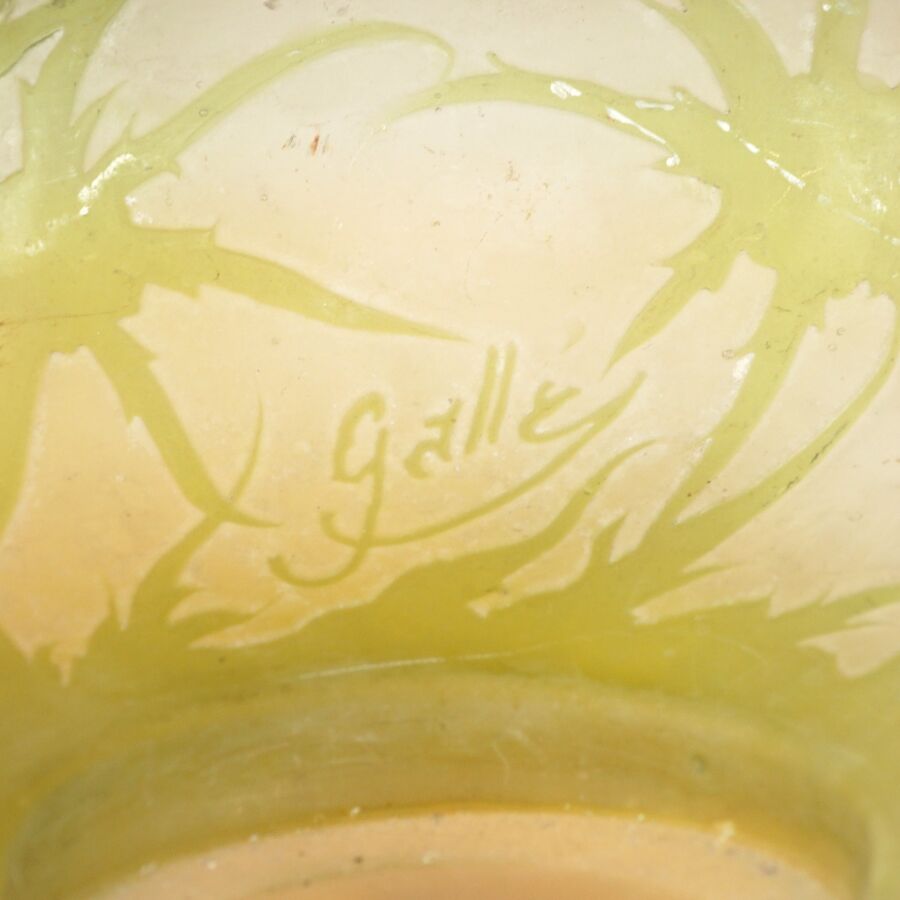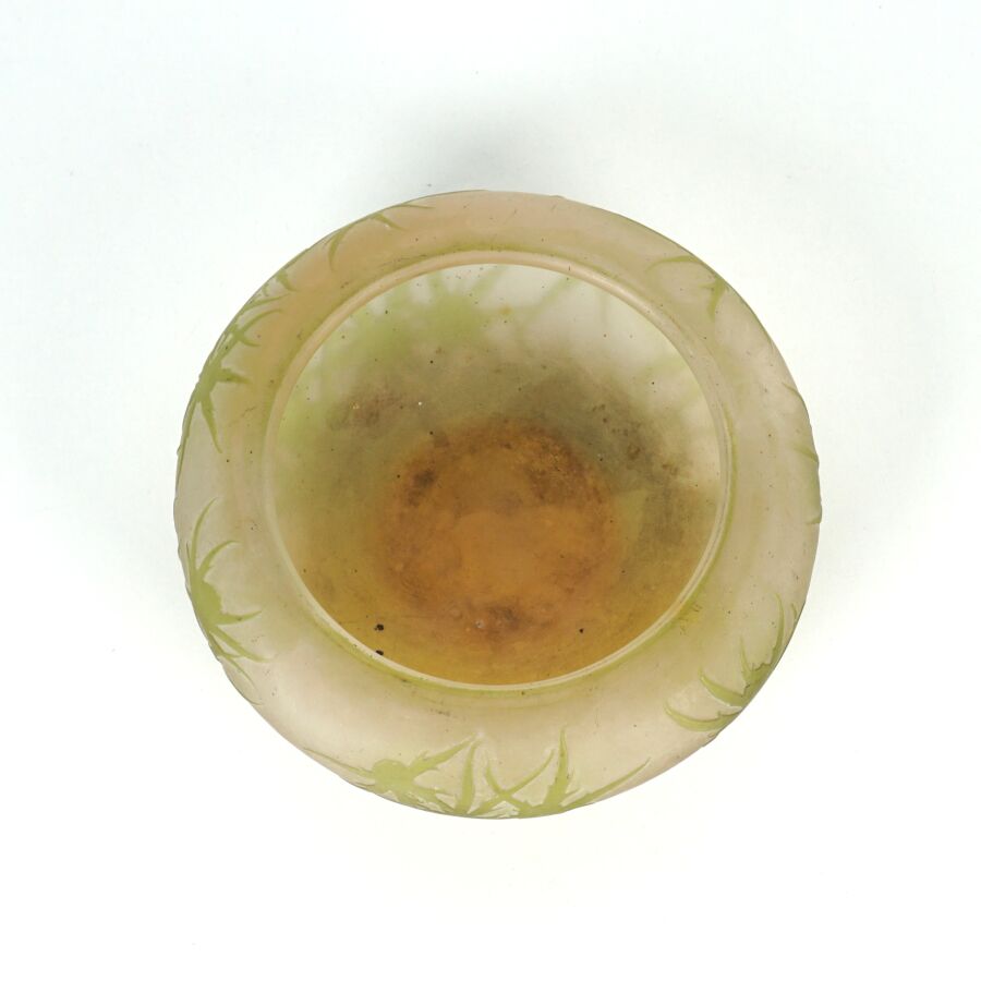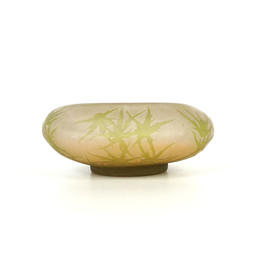 ETABLISSEMENTS GALLE (1904-1936) : Coupe en verre soufflé multicouches à décor dégagé à l'acide de chardons en vert sur fond beige orangé, signature en camée sur le corps, H. 6.5 cm. D. 15.3 cm.