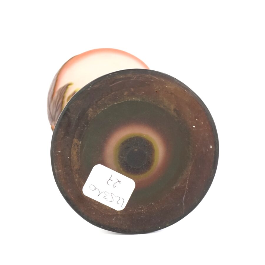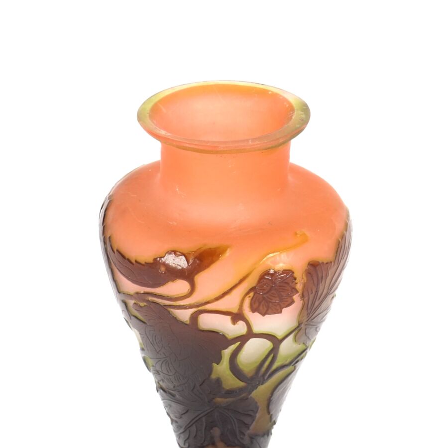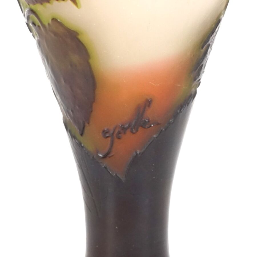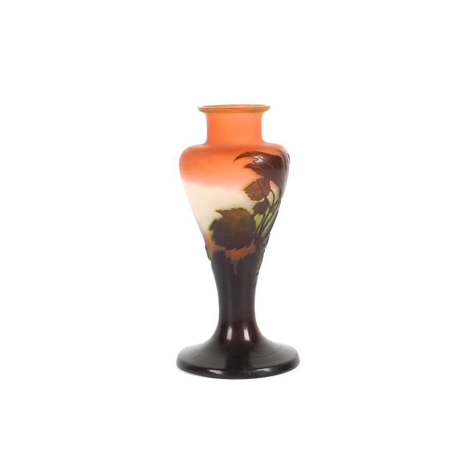 ÉTABLISSEMENTS GALLE (1904-1936) : Vase de forme balustre sur piédouche en verre soufflé multicouche à décor dégagé à l'acide de feuillages brun sur fond orange, vert et brun, signature en camée sur le pied, H. 15.7 cm.