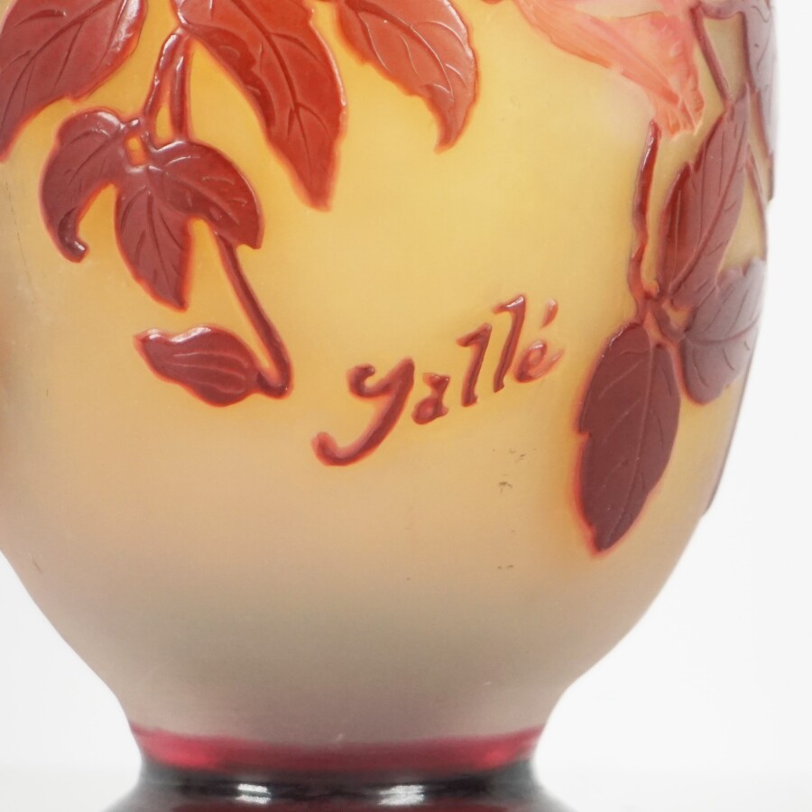 ETABLISSEMENTS GALLE (1904-1936) : Vase sur piédouche de forme ovoïde en verre à décor dégagé à l'acide de fleurs de clématites de couleur violine sur fond jaune, signature en camée sur le corps, H. 17 cm.
