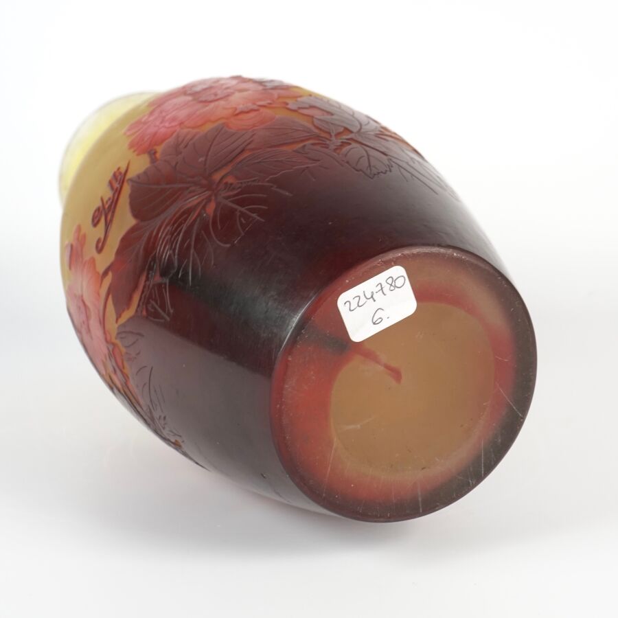 ETABLISSEMENTS GALLE (1906 - 1934) : Vase de forme balustre en verre multicouches à décor dégagé à l'acide de fleurs de pommier en rouge-brun sur fond satiné jaune-orangé, signature en camée sur le corps, H. 31 cm (rayures et traces).