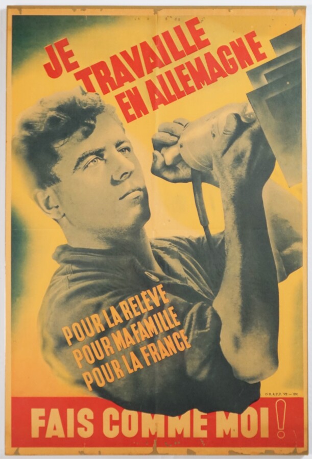 ETAT FRANÇAIS - AFFICHE DU STO - JE TRAVAILLE EN ALLEMAGNE - POUR LA RELEVE POUR MA FAMILLE POURLA FRANCE - FAIS COMME MOI, O.R.A.F.F.VII, 56 x 37,5 cm, traces de pliures, petites déchirures et légers manques en bas, non encadrée ni entoilée, BE/TBE.