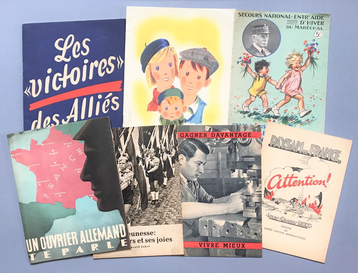 ETAT FRANÇAIS - ALLEMAGNE - PROPAGANDE - Ensemble comprenant : " La jeunesse ses devoirs et ses joies " par H. JUHRL, 32 pages, document de propagande des HJ, " Un ouvrier allemand de parle ", 31 pages, " Noël du Maréchal organisé par le Secours National ", album de coloriage, " Gagner davantage vivre mieux ", 12 pages, " Paysan de France, attention ! " et " Les victoires des alliés et la réalité ", 55 pages, TBE.