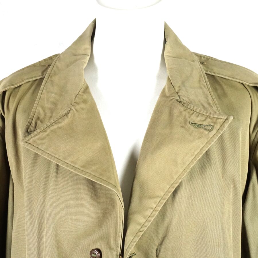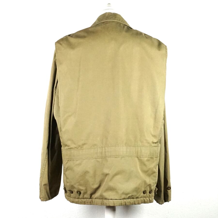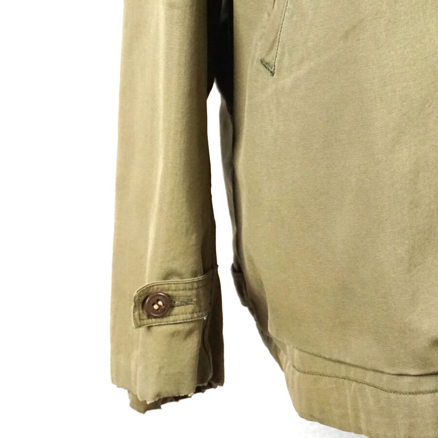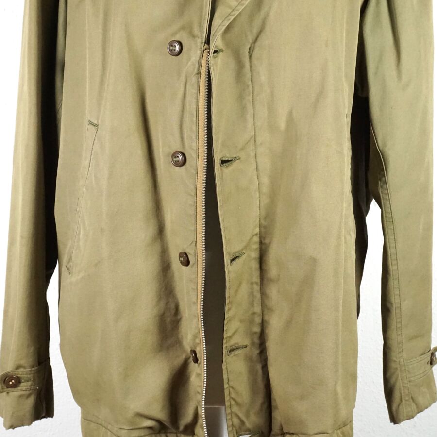 ETAT-UNIS - BLOUSON USN TYPE N-4, en toile vert olive, ouvrant à 5 boutons et fermeture éclair " TALON ", 2 poches latérales, fausse ceinture cousue dans le dos, doublure intérieure en drap laineux, étiquette taille 40L au col, déchirures et usures au manches, Seconde Guerre Mondiale, BE.