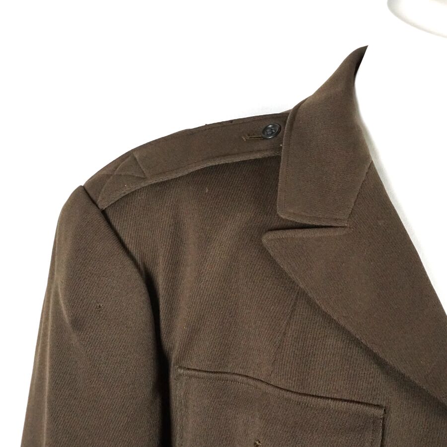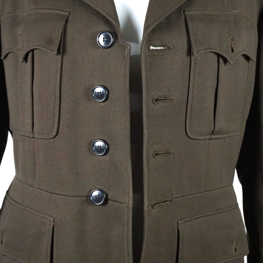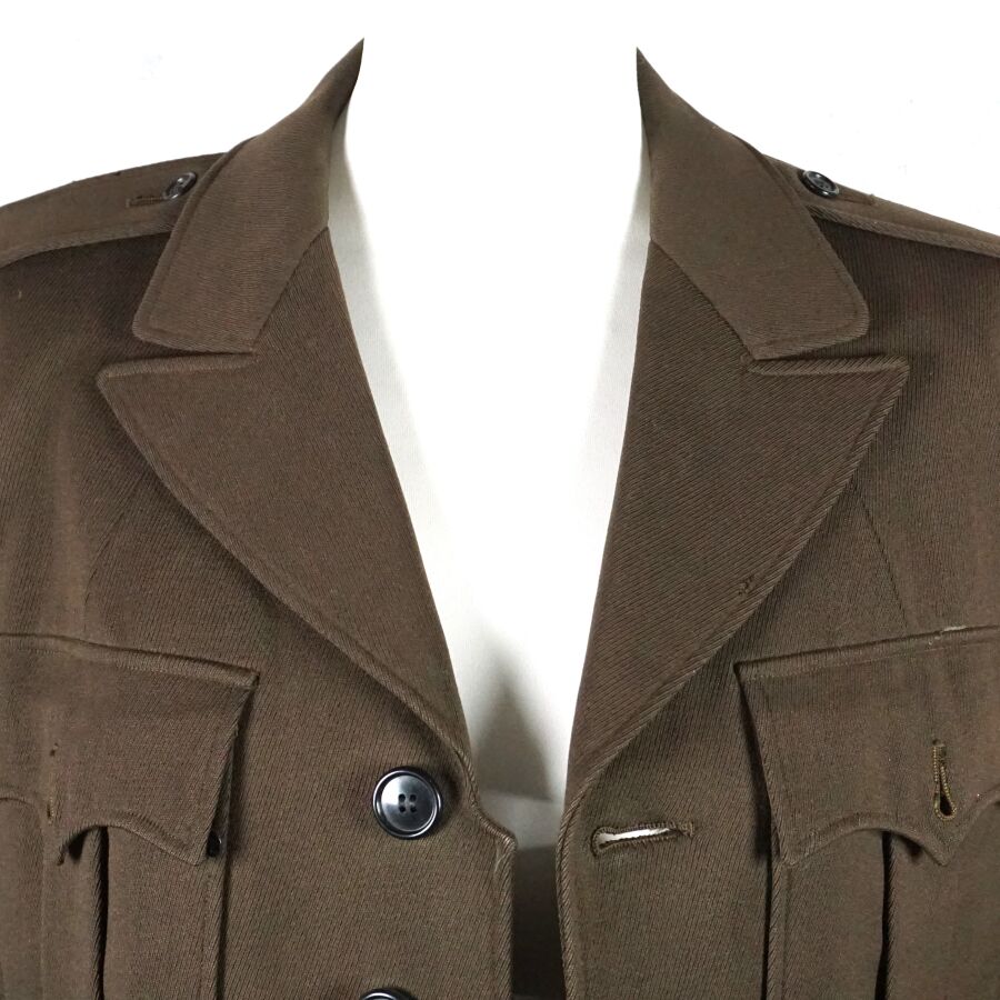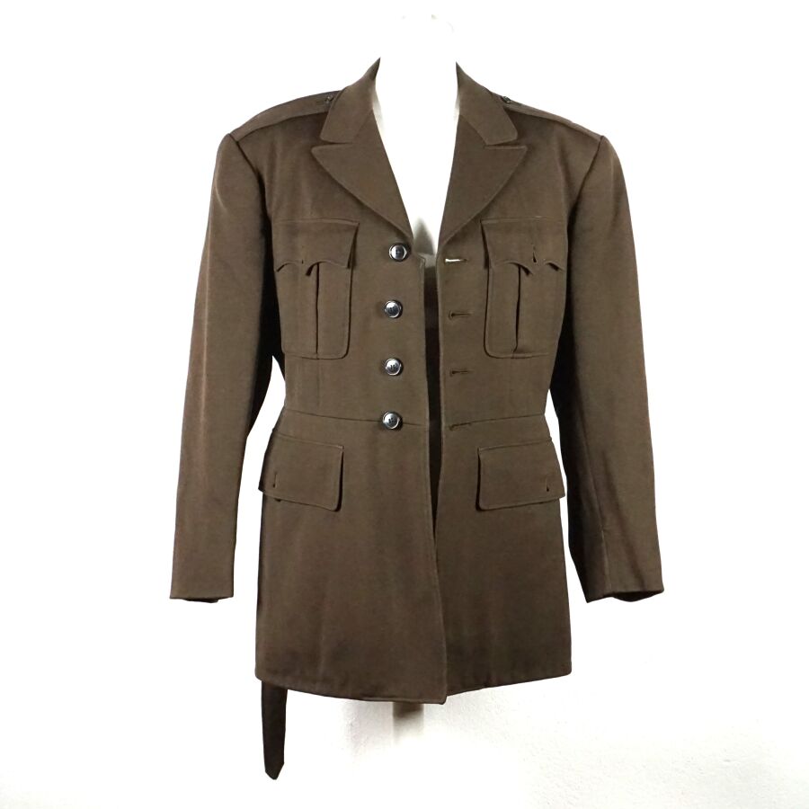 ETAT-UNIS - VESTE DE SORTIE en drap marron à col ouvert, ouvrant à 4 boutons en bakélite noir, 4 poches, ceinture dorsale, étiquettes ARMY OFFICIER'S UNIFORM et la seconde dans une poche intérieure comportant le code " no. 720 ", datée " Dec 1. 1942 " et taille 37 REG(ulation), doublure en satinette vert, Seconde Guerre Mondiale, TBE.