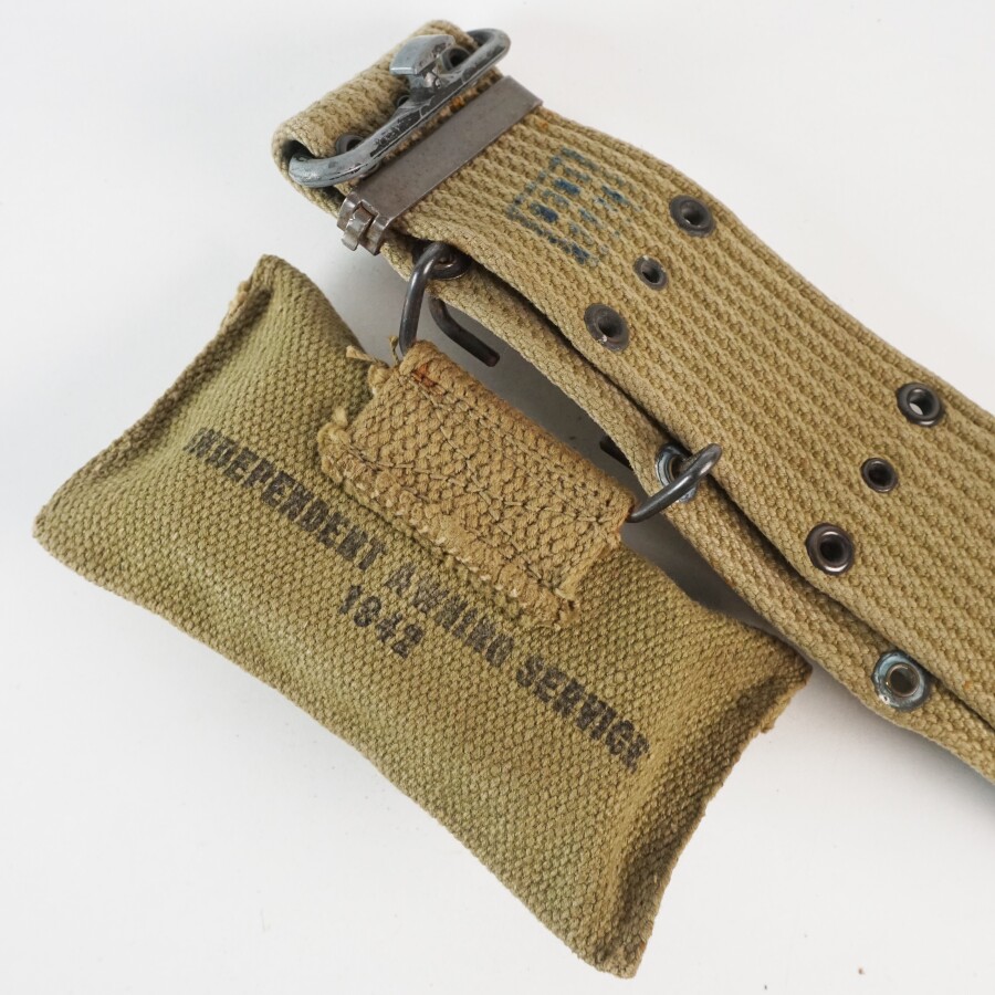ETATS-UNIS - Ensemble comprenant 2 CEINTURONS MODELE 1936, en coton beige avec POCHETTES A PANSEMENTS dont une avec BOITE FIRST AID, pochettes datées " 1942 ", marquages des ceinturons illisibles, Seconde Guerre Mondiale, BE/TBE.