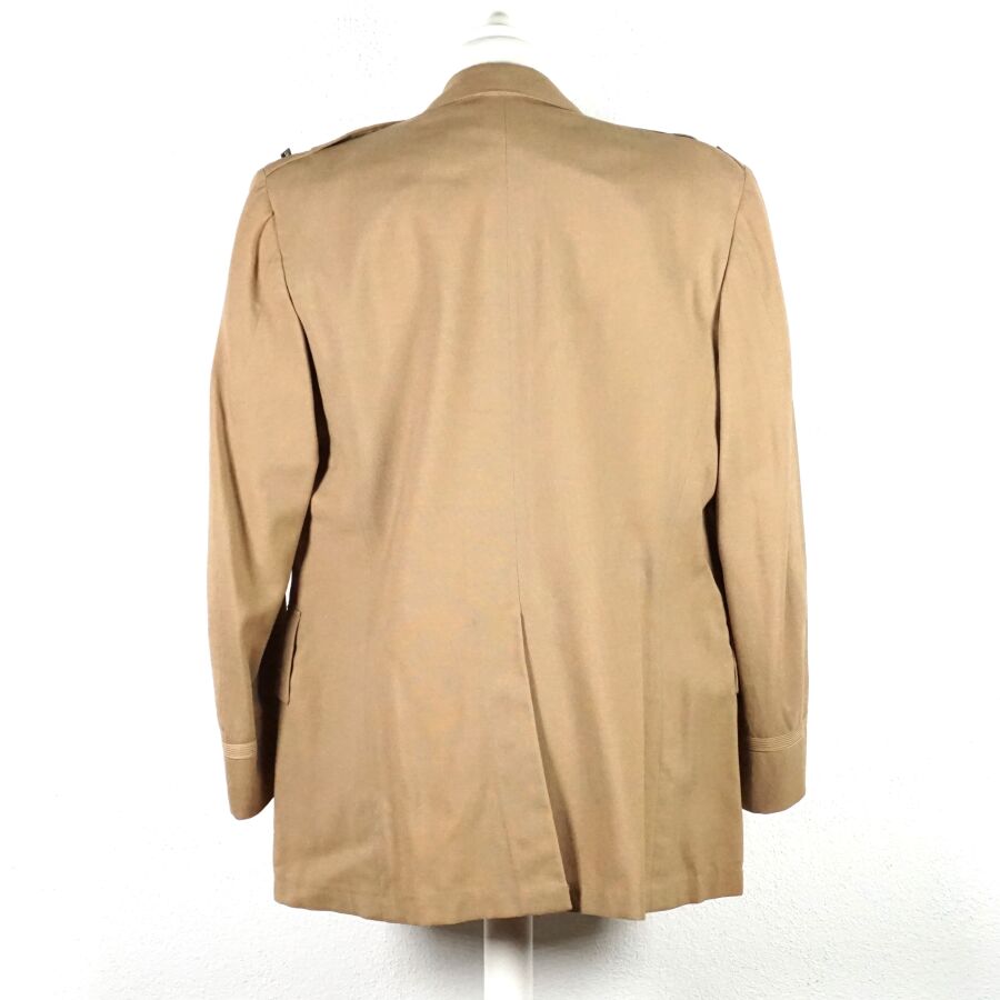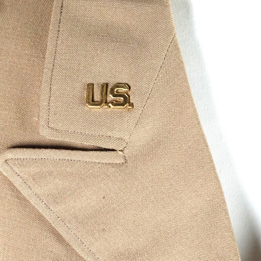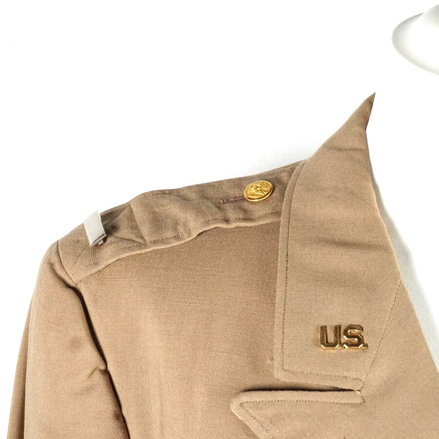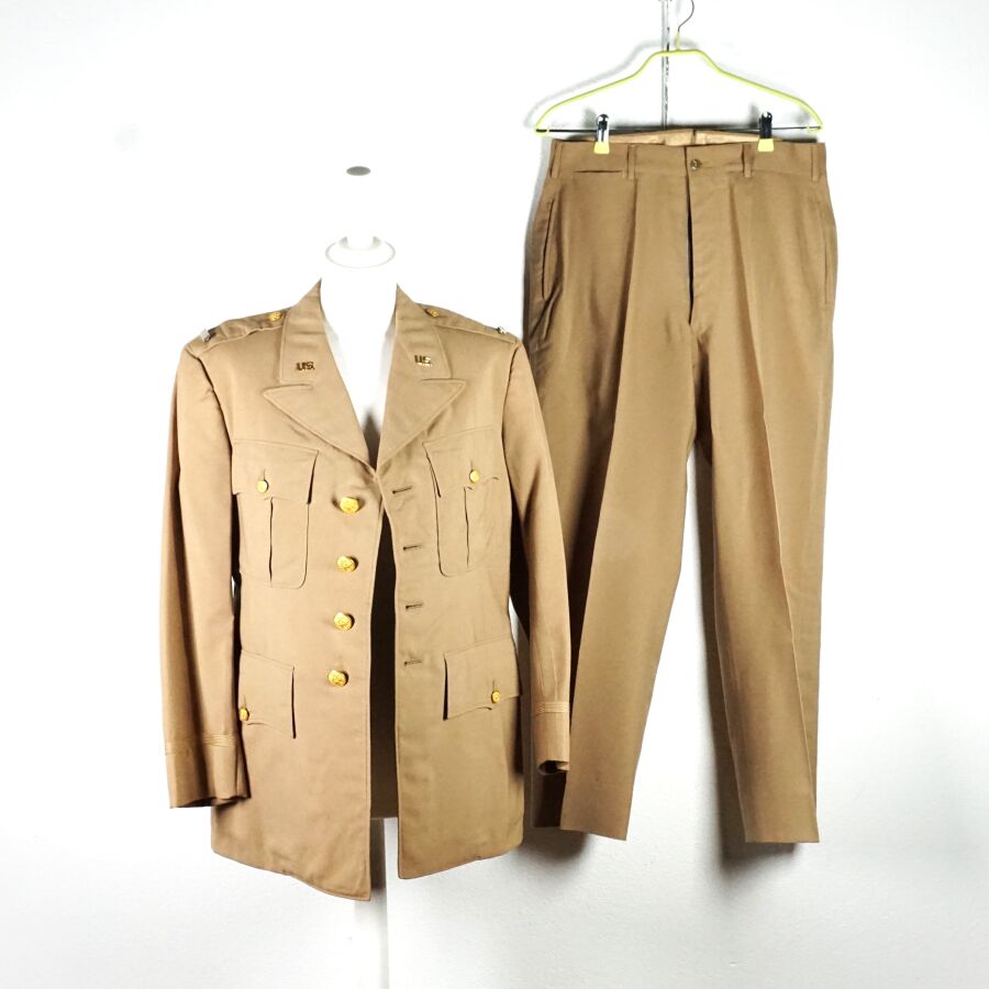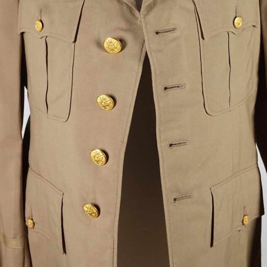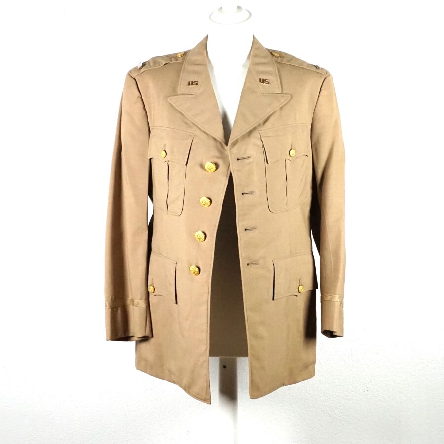 ETATS-UNIS - UNIFORME DE SORTIE DE LIEUTENANT comprenant : VAREUSE en drap beige à col ouvert ouvrant à 4 boutons, 4 poches, grade de lieutenant au pattes de col, étiquette intérieure du tailleur " Clipper Craft Clothes ", taille 37 short, doublure en satinette beige et PANTALON au modèle, Seconde Guerre Mondiale, TBE.