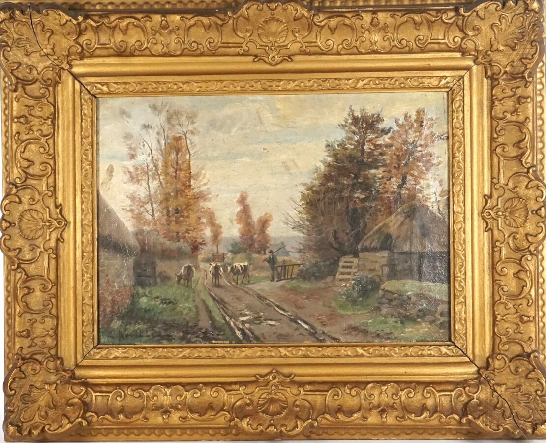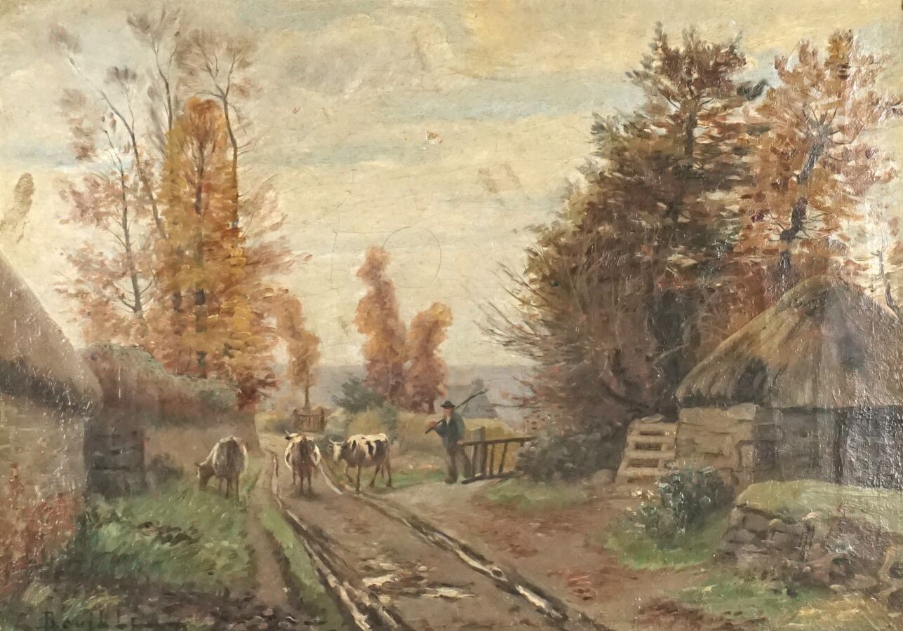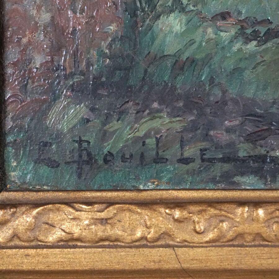 Etienne BOUILLE (1858-1933), "Le troupeau", huile sur toile signée en bas à gauche, 32.5 x 46 cm (écaillure).