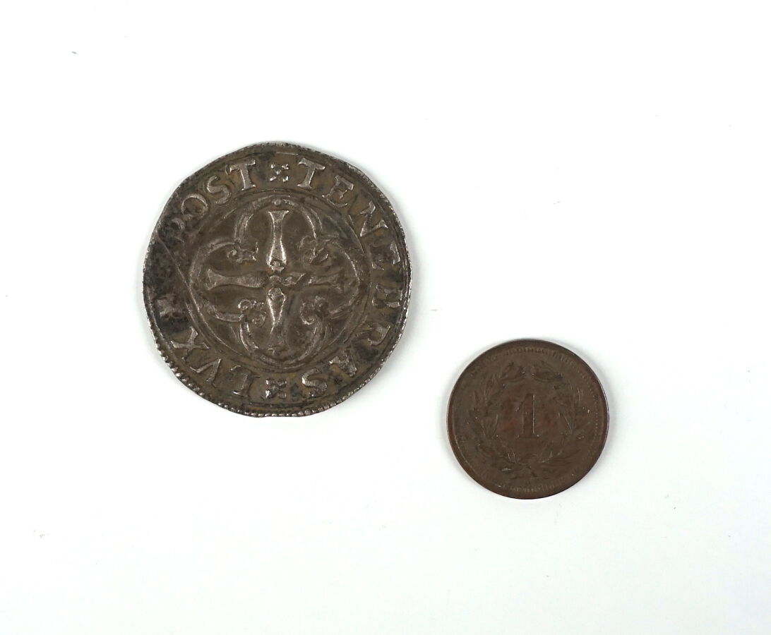 ETRANGERES SUISSE : Lot de 2 monnaies : Genève 3 Sols 1563, billon, 3,54 g environ et 1 Centime 1876, TB+ (Hmz 301i).