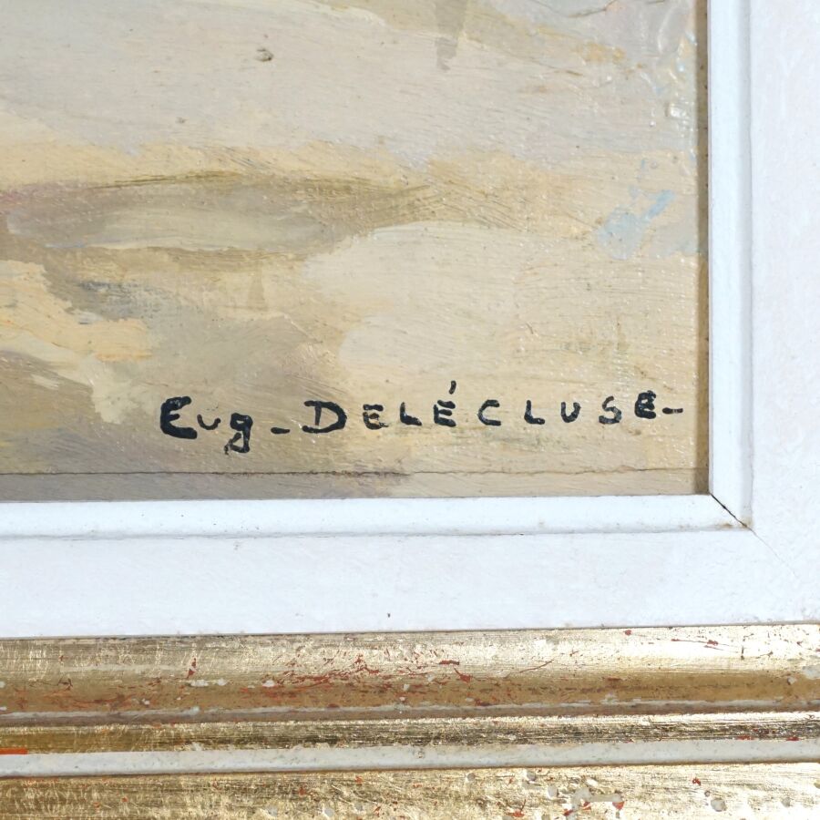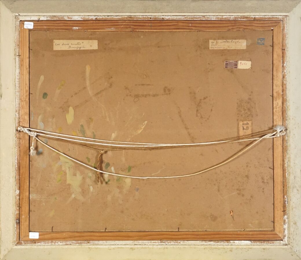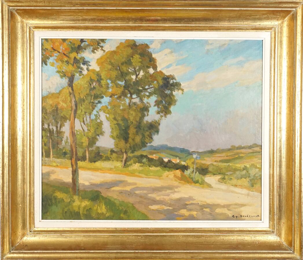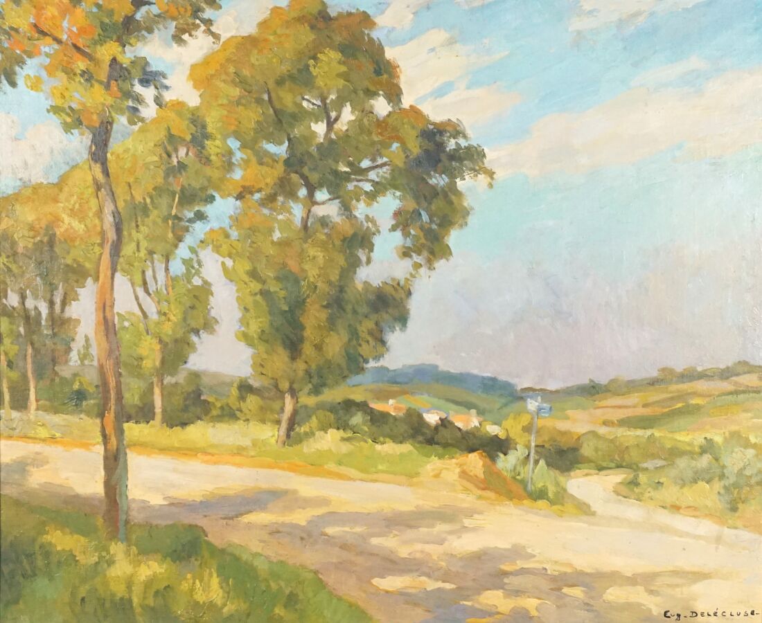 Eugène DELECLUSE (1882-1972), "Les deux routes, Bourgogne", huile sur carton signée en bas à droite, 43.3 x 59.9 cm.