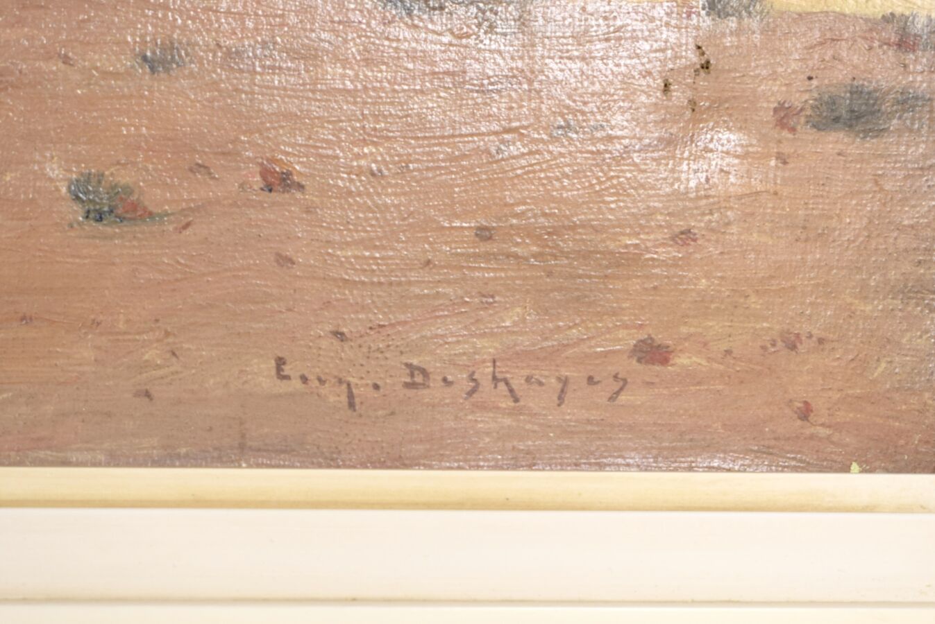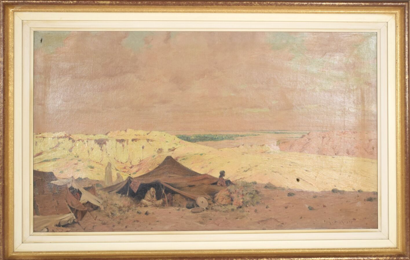 Eugène DESHAYES (1862/68-1939), "Repos à l'ombre des dunes", huile sur toile, 31 x 53..5 cm (trous à la toile, traces, manques).