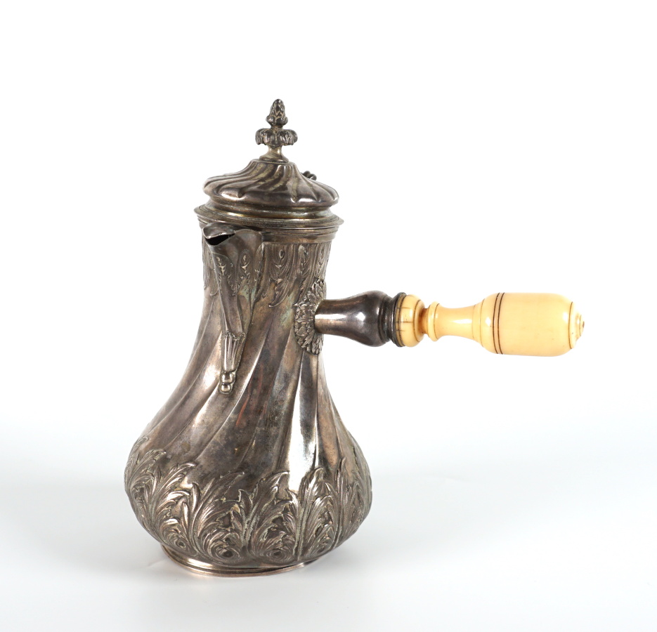 Eugène DOUTRE-ROUSSEL (reçu en 1865) : Petite verseuse de forme balustre sur petit talon en argent, poinçon Minerve, poinçon de MO (D. ROUSSEL et domino double deux), à décor de côtes torses et de frises feuillagées, le fretel formant un bouton de fleur, l'anse latérale en ivoire tourné, H. 17 cm (chocs à la base, talon tordu). Poids brut : 300 g environ.