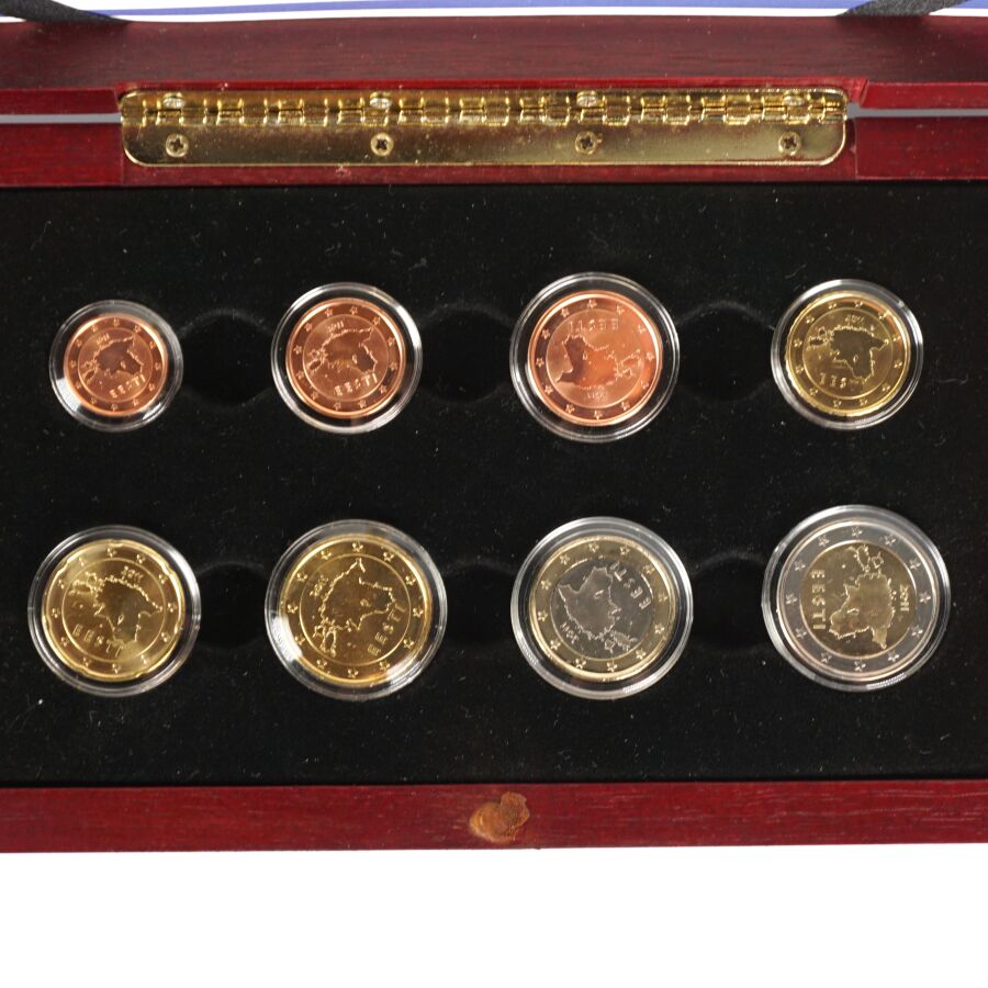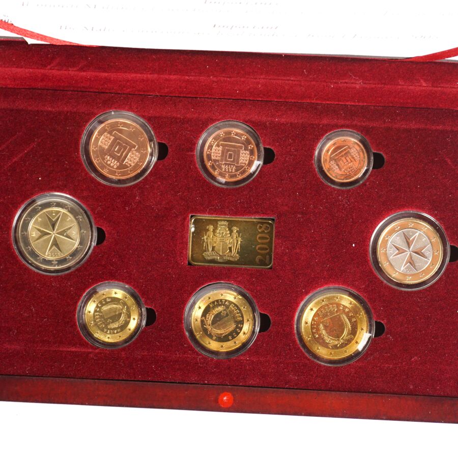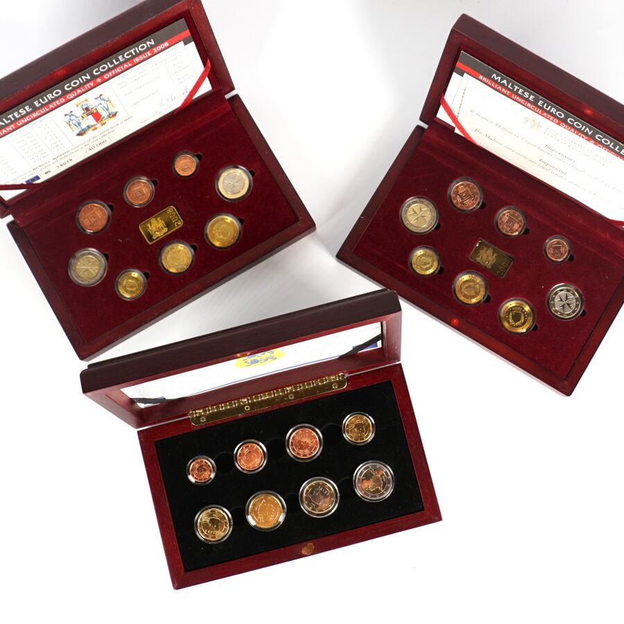 EURO : Lot de 3 coffrets comprenant : - Estonie 2011 : 8 monnaies), - (x2) Malte BU 2008 : 8 monnaies et 1 lingotin.
