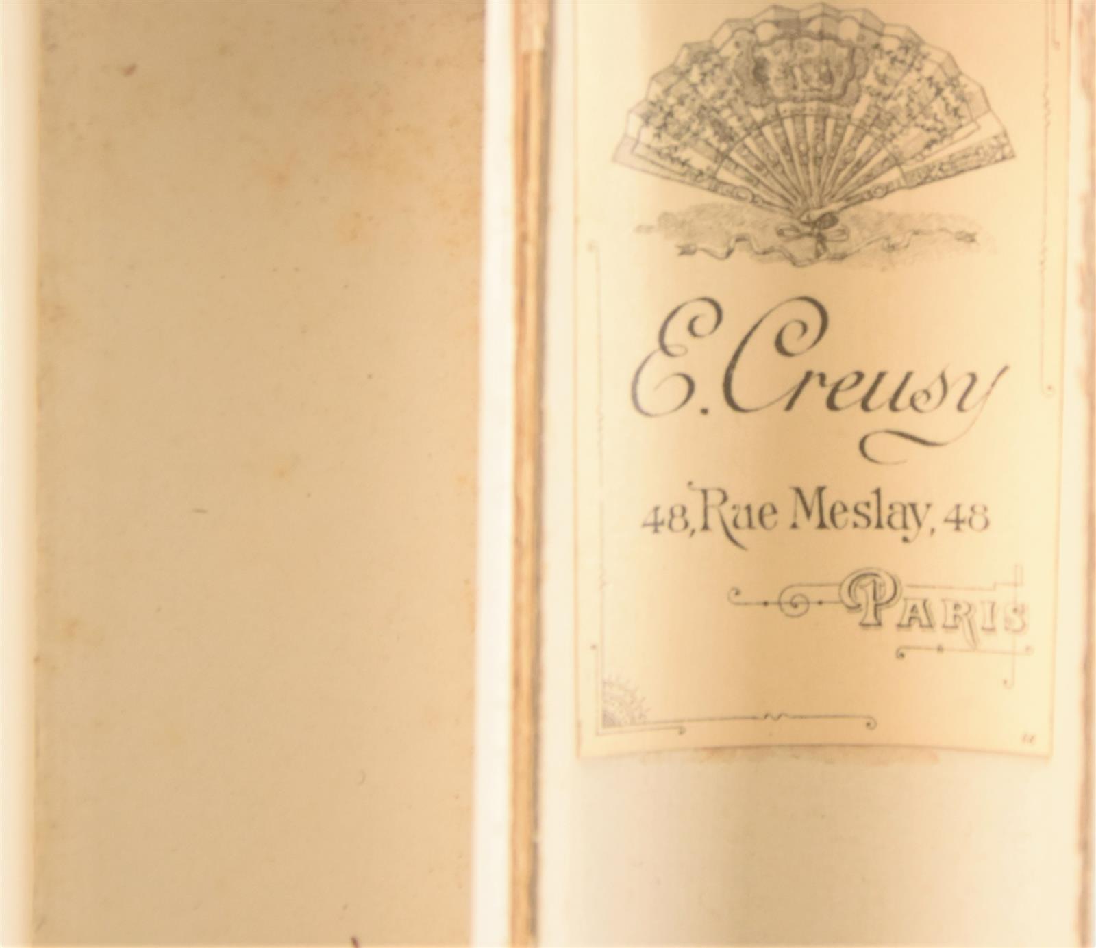 Eventail monture en os à décor à l'or, le cartel à décor d'une scène galante style Louis XVI, fin du 18e siècle, H. 27 cm, L. 47 cm (dans un coffret rapporté).