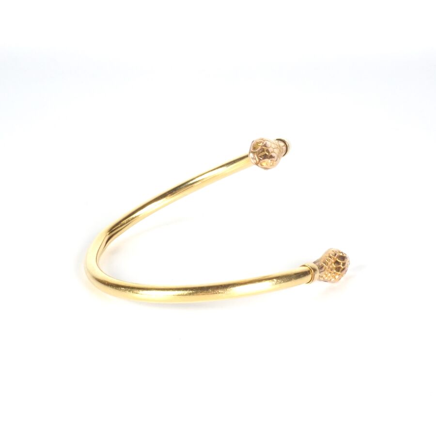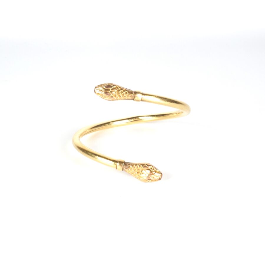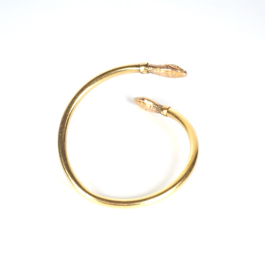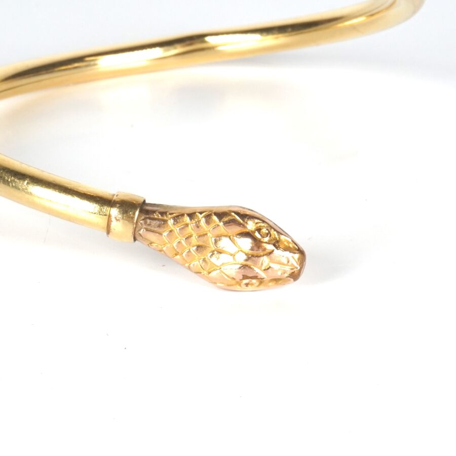 EXPERTISE Bracelet jonc "Serpent" en or jaune 9K (375/oo), les deux extrémités à motif d'une tête de serpent, Larg. Jonc : 5 mm. Larg. Têtes : 1 cm. Diam. Tour de poignet intérieur : 6.5 cm. Poids brut : 15.3 g environ.