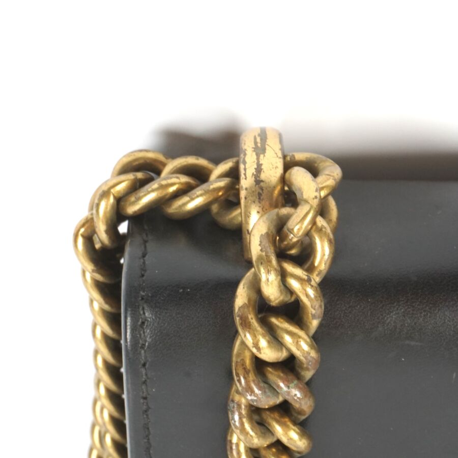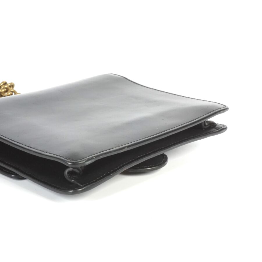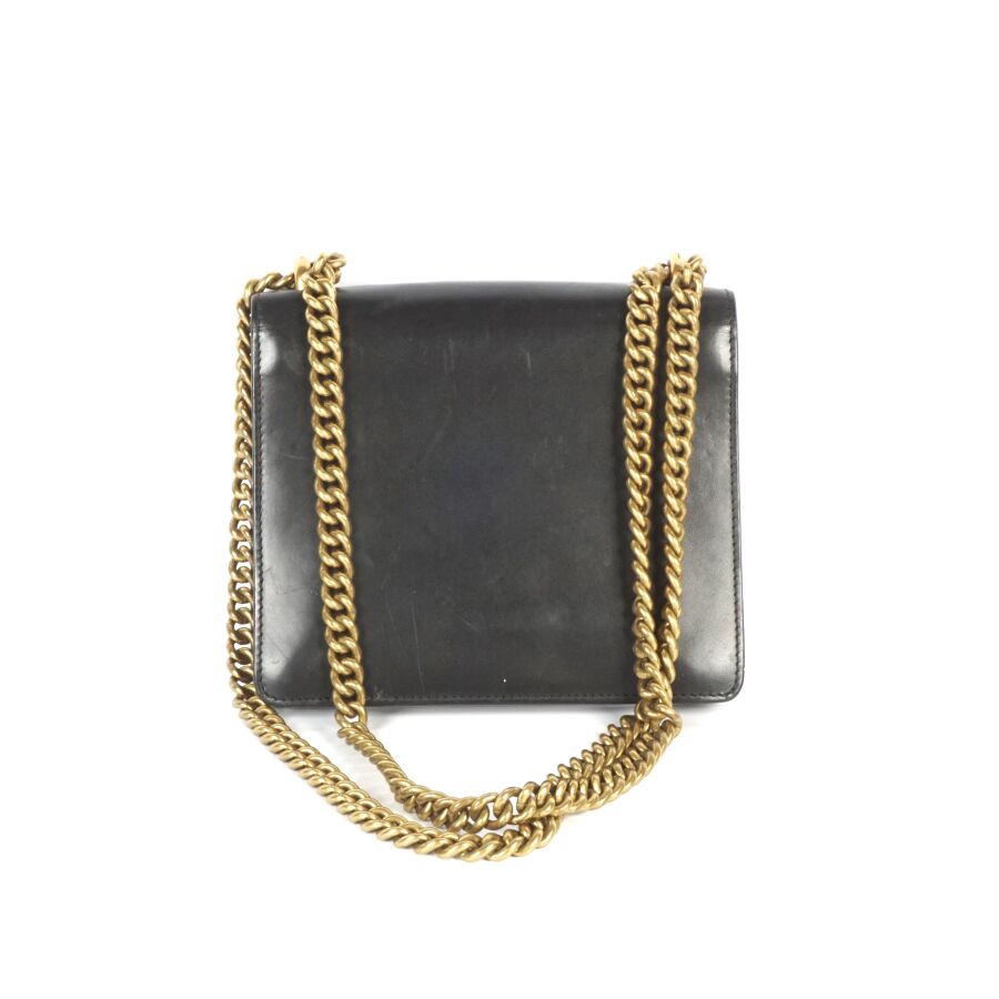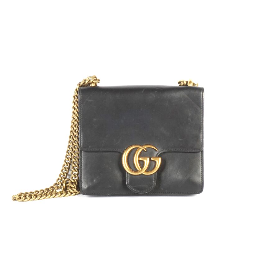 EXPERTISE GUCCI : Sac porté épaule en cuir lisse de couleur noire et bijouterie en métal doré, le rabat avec système de fermeture en métal doré orné du monogramme de la marque, intérieur en tissu beige avec étiquette et plaque en cuir logotée et numérotée, bandoulière formée de deux chaînes en métal doré (permettant de régler la taille), Dim. 16.2 x 19 x 3.7 cm (quelques usures et rayures).