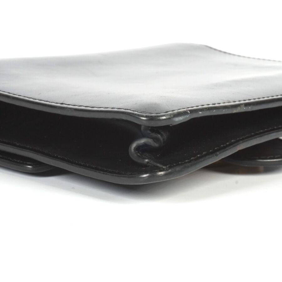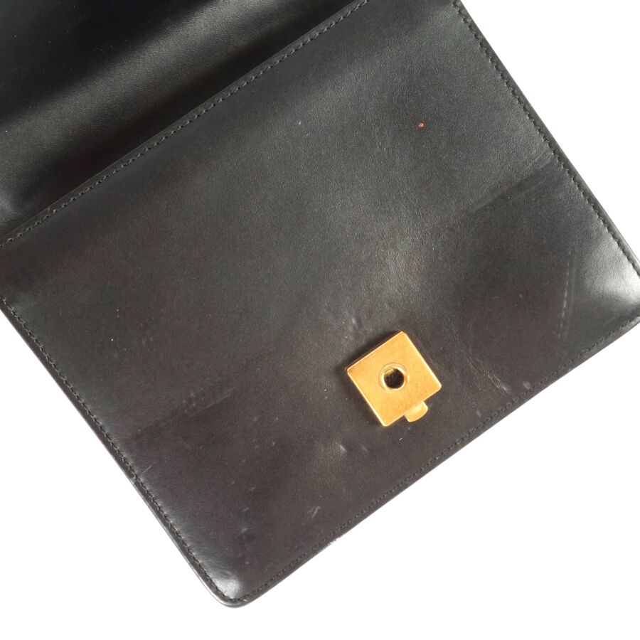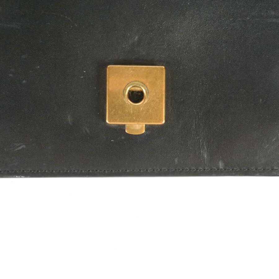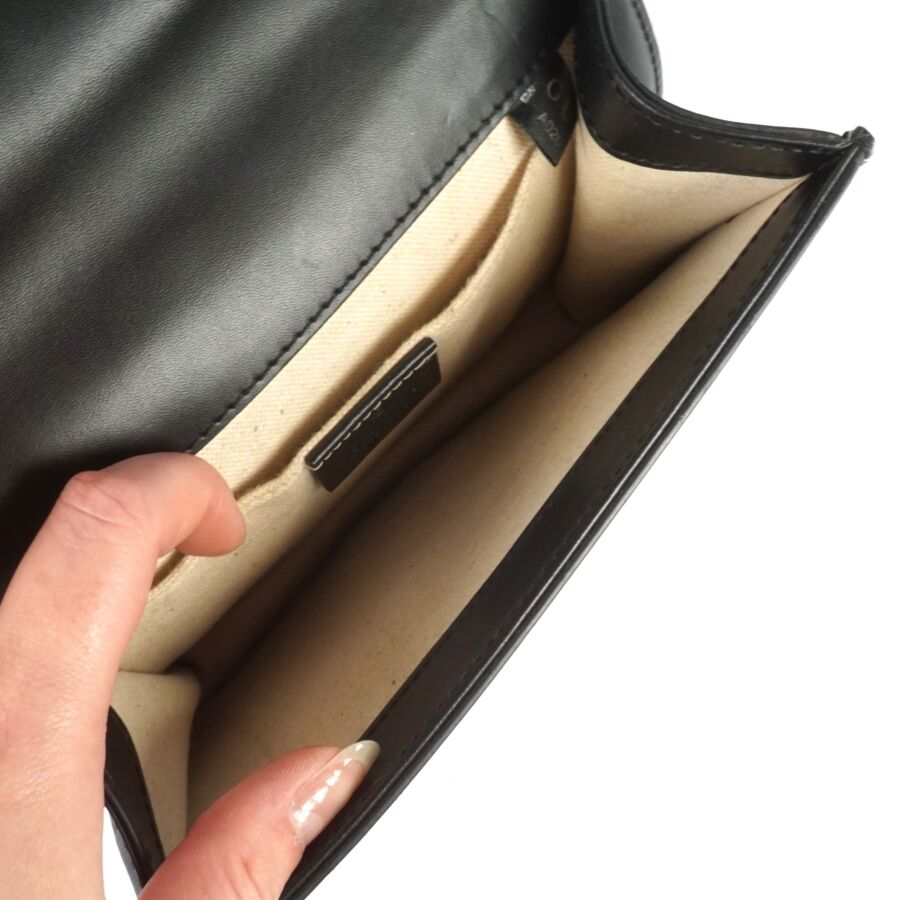 EXPERTISE GUCCI : Sac porté épaule en cuir lisse de couleur noire et bijouterie en métal doré, le rabat avec système de fermeture en métal doré orné du monogramme de la marque, intérieur en tissu beige avec étiquette et plaque en cuir logotée et numérotée, bandoulière formée de deux chaînes en métal doré (permettant de régler la taille), Dim. 16.2 x 19 x 3.7 cm (quelques usures et rayures).