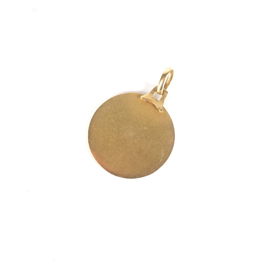 EXPERTISE Médaille de baptême en or jaune 18K (750/oo), Diam. 1.75 cm. Poids brut : 2.5 g environ.