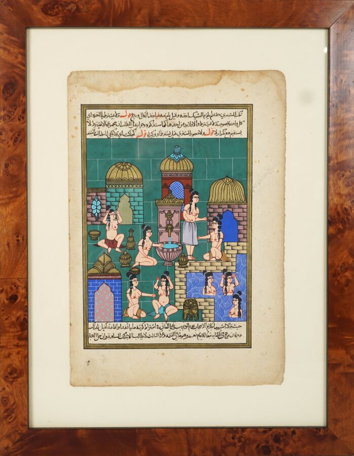EXPERTISE Page d'un livre figurant une scène de hammam, travail moderne, Turquie, 27 x 18.2 cm.