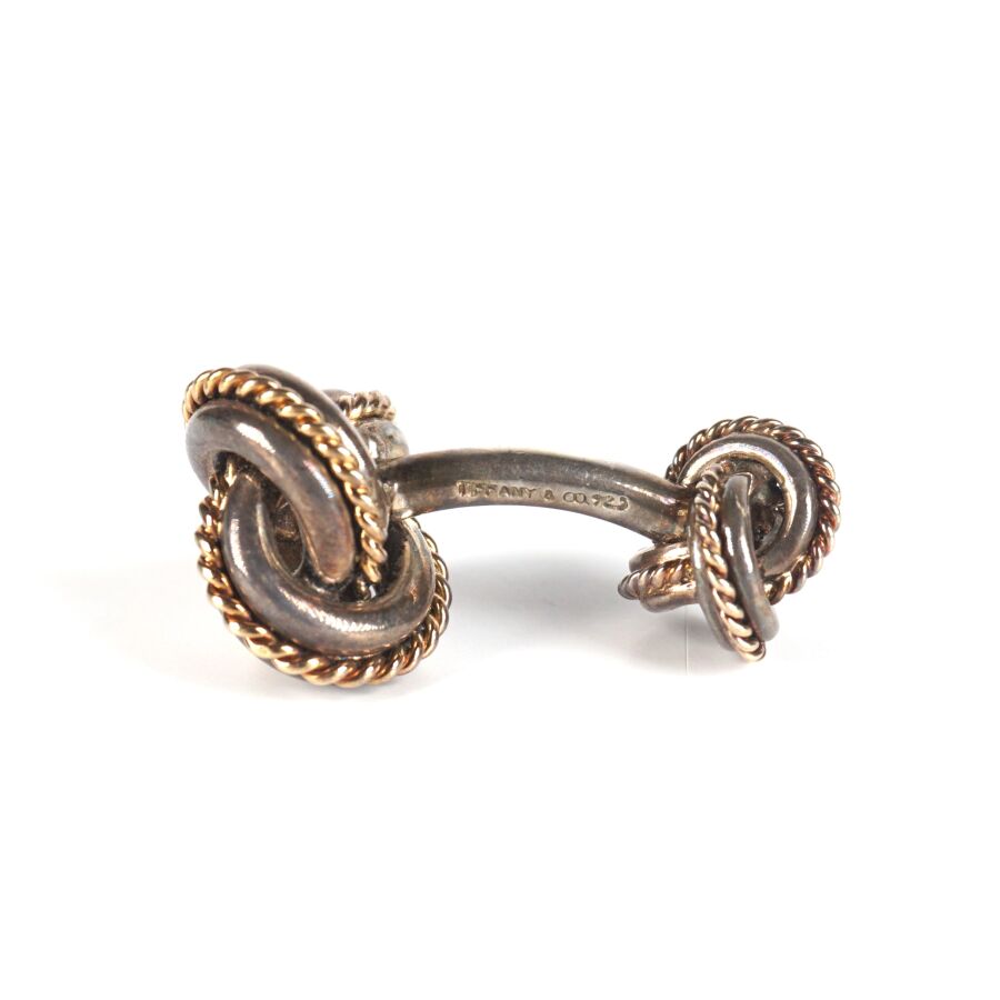 EXPERTISE TIFFANY & CO : Paire de boutons de manchette en or 2 tons 18K (750/oo) à motif de noeuds, signés, présentée dans leur écrin d'origine, avec sa surboîte, L. 2.9 cm. Poids brut : 20.3 g environ (AC).