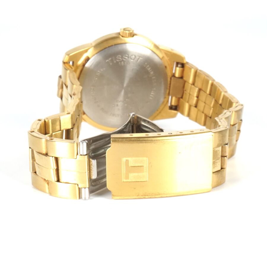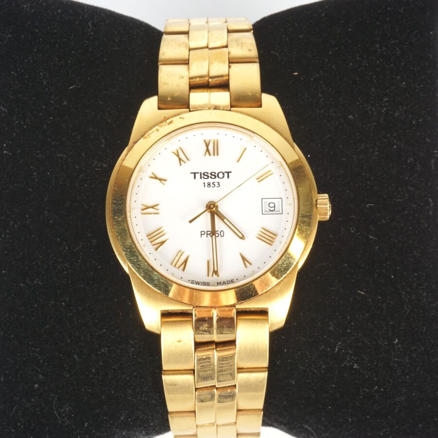 EXPERTISE TISSOT : Montre bracelet pour homme, modèle "PR 50", acier doré, fond émaillé blanc, chiffres romains pour les heures, guichet dateur à 3H, fond signé et numéroté, boucle déployante logotée, Diam. Boîtier : 3.5 cm. L. Tour de poignet (plié) :9.3 cm environ (petites usures).