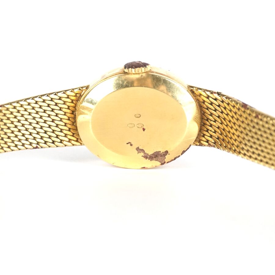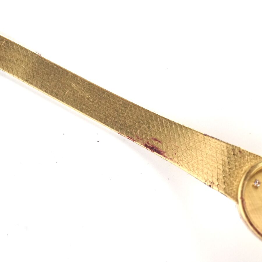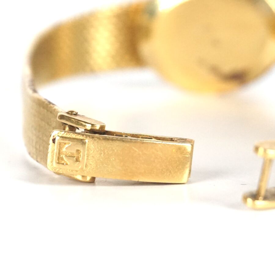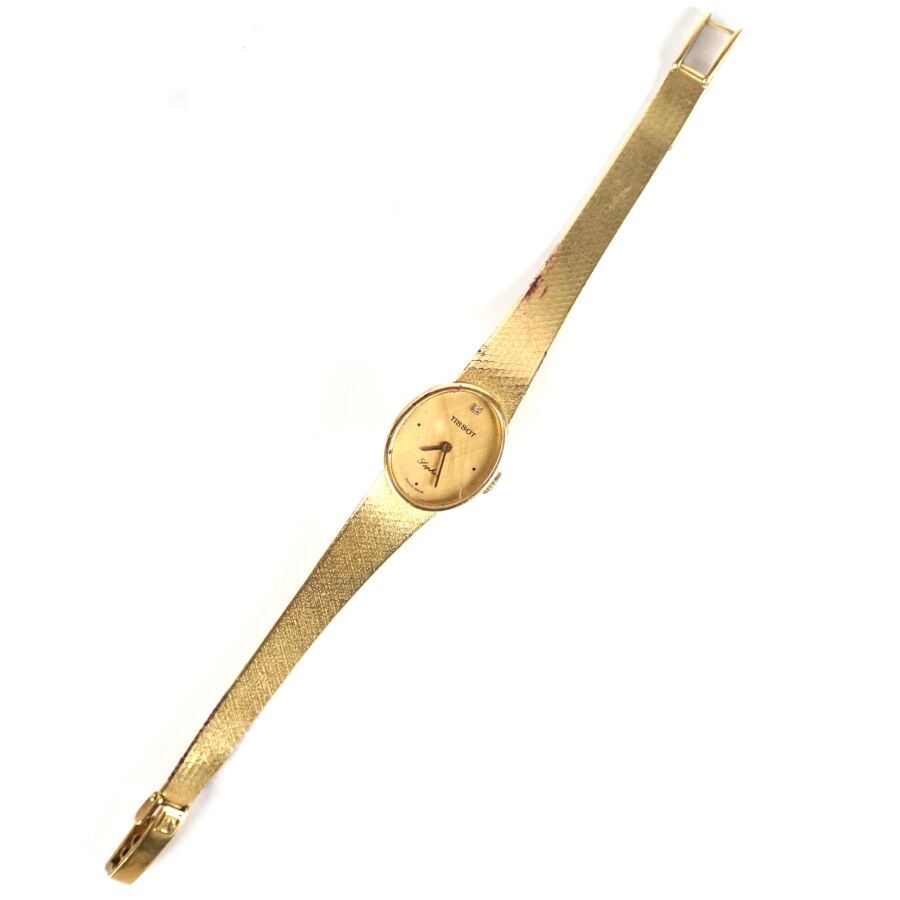 EXPERTISE TISSOT : Montre de dame en or jaune 18K (750/oo), boîtier de forme ovale, cadran doré signé, diamant formant index à 12H, fond à clip, bracelet articulé maille plate en or jaune 18K (750/oo), fermoir cliquet logoté, Dim. Boîtier : 2.3 x 1.9 cm. L. Totale : 18 cm. Poids brut : 34.2 g environ (fente au verre).