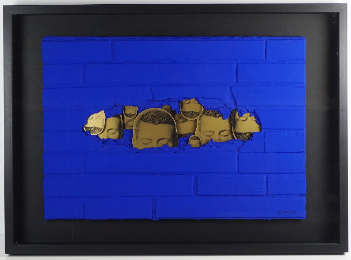 EXPOSITO (1991), "Blue Wall" 2022, technique mixte et collage, signée en bas à droite, 40 x 60 cm (encadrée sous verre).
