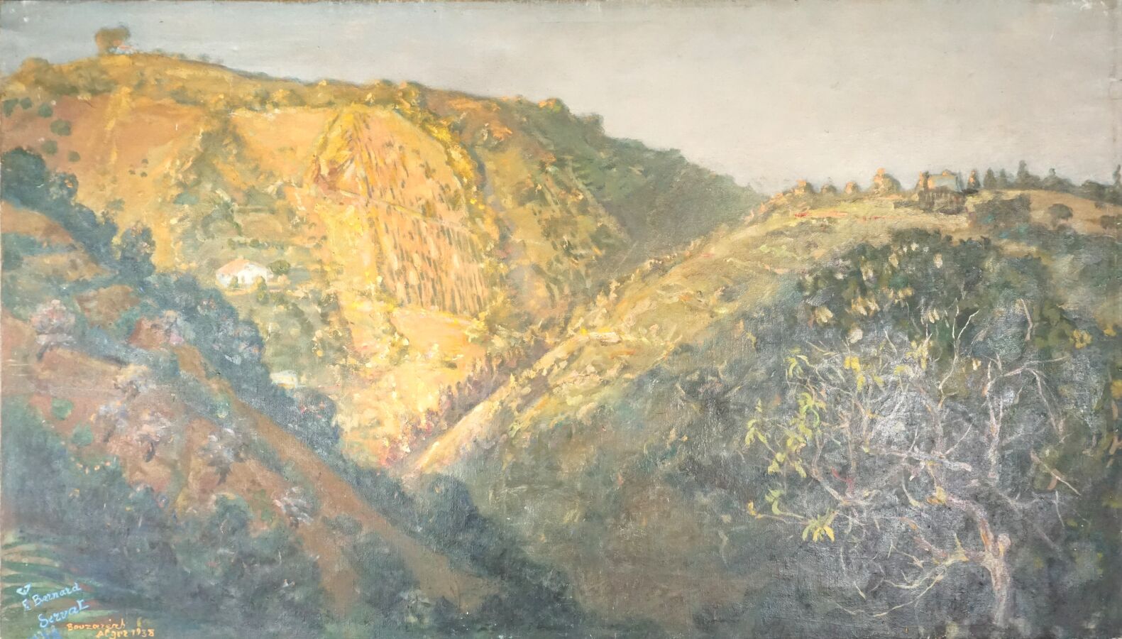F. Bernard SERVAT (XXe), "Les collines d'Alger" 1938, huile sur toile signée, située et datée en bas à gauche, 77 x 135 cm (usures en bordures).