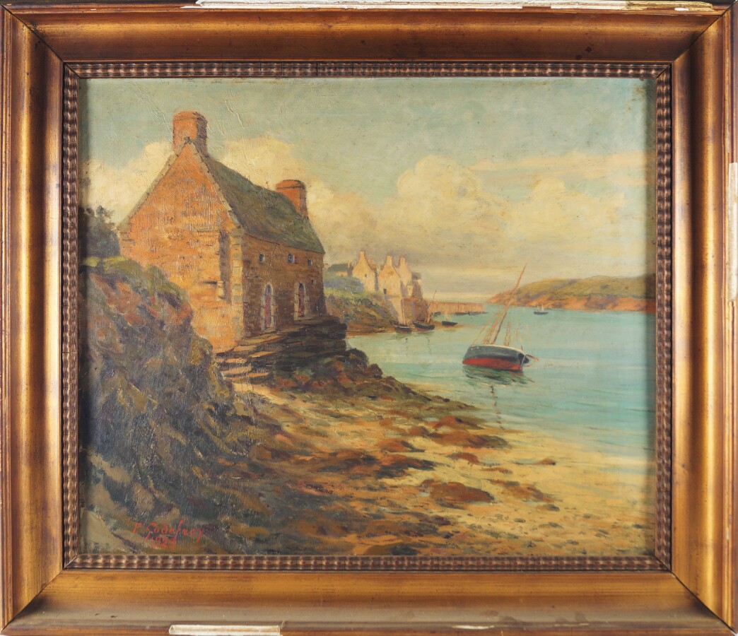 F. GODEFROY (XXe), "Maisonnette sur la plage" 1923, huile sur toile signée et datée en bas à gauche, 46 x 55 cm (petit trou de punaise à droite, infimes traces en haut à droite).