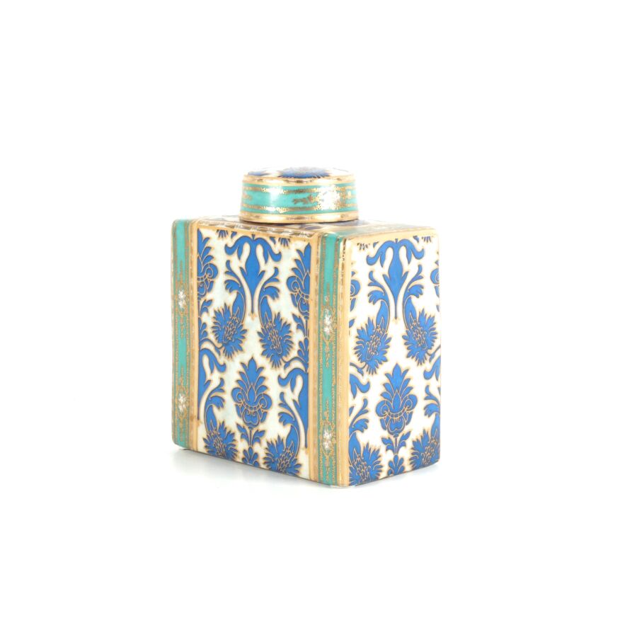 Fabienne JOUVIN (1962), Potiche de section carrée, avec son bouchon, porcelaine émaillée en bleu et vert et rehauts d'or, marqué au tampon dessous, H. 15 cm (petites usures à l'émail).