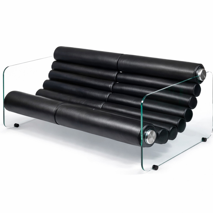 Fabio LENCI (né en 1935) : Canapé modèle "Hyaline" verre, métal chromé et cuir noir, L.135 x l.90 x H.70 cm. (éraflures sur le cuir, rayures sur le verre)