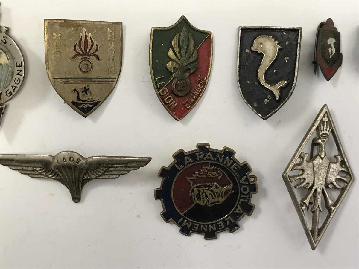 FABRICATION LOCALE - Ensemble comprenant 10 INSIGNES et 2 INSIGNES REDUCTION dont : 13ème DBLE (Drakkar), 7/1 RMSM, 1er RPIMa, 12 REGIMENT DE CUIRASSIERS, COMMANDO PARACHUTISTE LAOS, 5ème REGIMENT DE CUIRASSIERS, en métal ou bronze peint, sans garantie, DANS L'ETAT.
