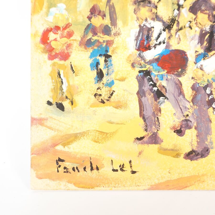 Fanch LEL (1930-2022), "Défilé de Bagadoù à Dinan", gouache sur carton signée en bas à gauche, titrée et contresignée au dos, 16 x 22 cm.