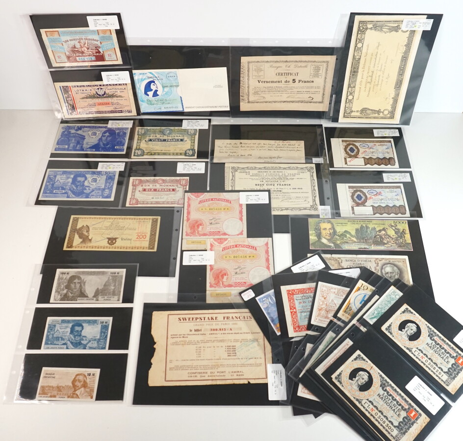 FANTAISIES : Ensemble à découvrir dont : spécimens, billet breton de 10 Lur, bon de monnaies de nécessité, 1 x 10 Pesetas 1940 nécessité espagnole, bons de versements d'or pour la défense nationale, quittances, reçus, certificats de versements, chèques, bon du trésor, billets de loterie nationale, factices, actions et divers, 69 exemplaires environ.