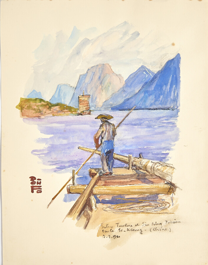 FARRÈRE (Claude) - Missions et Croisières. Mer Rouge Mer de Chine Océan Indien - Paris ; André Barry, 1944 - 1 volume In-4° en feuilles sous couverture rempliée illustrée couleurs à pleine page au 1er plat, sous étui éditeur cartonné avec pièces de titre papier vert au 1er plat et au dos (1er mors fendu) - Des rousseurs éparses - Belles illustrations en couleurs d'après les aquarelles de Charles Fouqueray : 2 frontispices, vignette au titre, 30 compositions in texte et 10 planches hors texte - Bon exemplaire numéroté sur vélin pur fil du Marais (n°554 sur les 600 + 10 hors commerce).