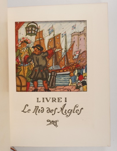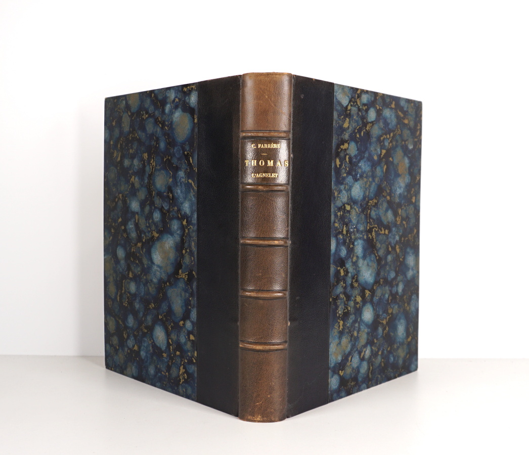 FARRÈRE (Claude) - Thomas L'Agnelet. Gentilhomme de fortune - Paris ; Javal et Bourdeaux, 1927 - 1 volume grand In-4° - Paris ; Javal et Bourdeaux, 1927 - 1 volume grand In-4° - 18 aquarelles hors texte en couleurs dont frontispice, bandeaux, motifs décoratifs et culs-de-lampe par Guy Arnoux - Reliure de l'époque demi-chagrin marine - Couvertures et dos conservés - Dos à nerfs titré or (passé uniformément) - Très bon exemplaire numéroté sur vélin d'Arches (n°86, tirage total : 175), enrichi d'1 envoi autographe signé de Farrère au faux titre : " Pour Henri Cangardel avec toute l'affectueuse amitié de son vieux camarade de croisière. Mais vous n'avez donc jamais assez de bouquins de cet auteur exaspérant ? Encore heureux qu'il vous aime bien ! ".