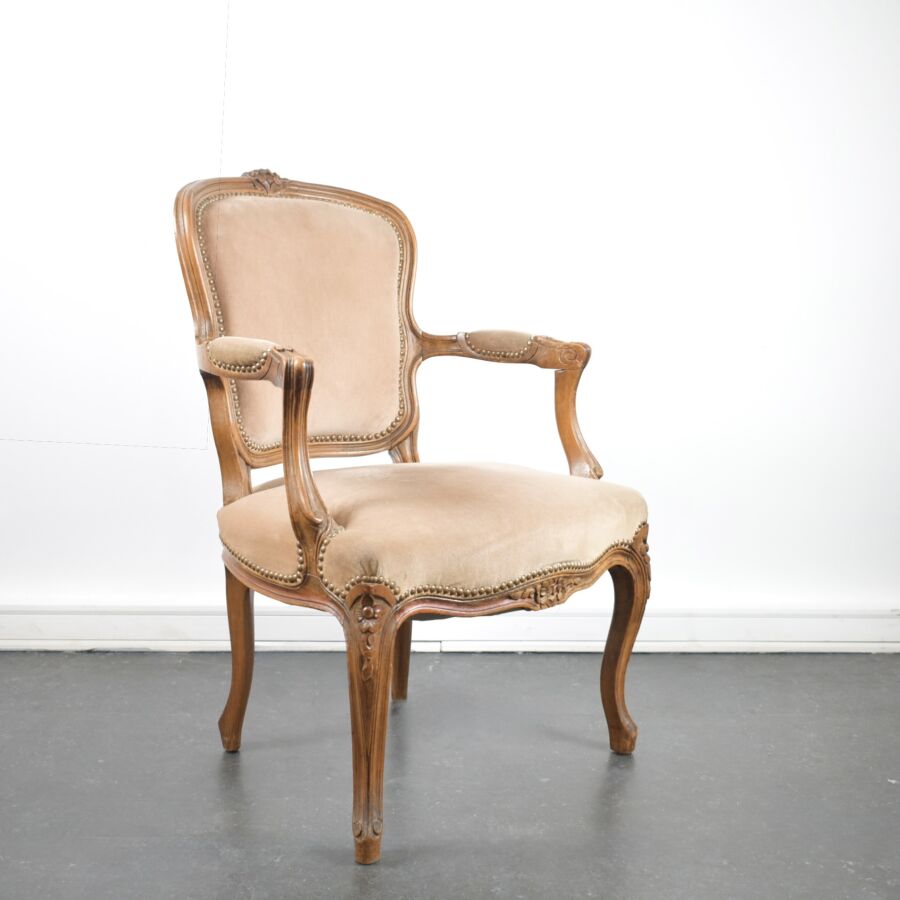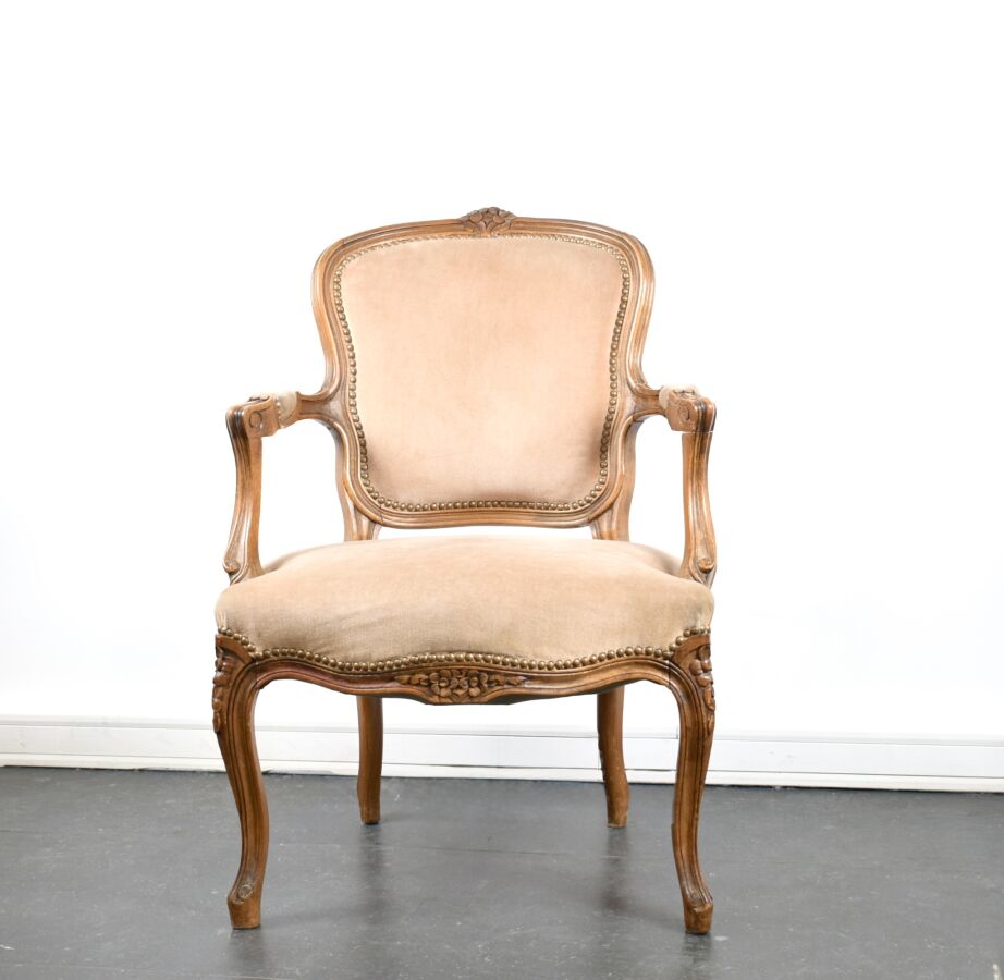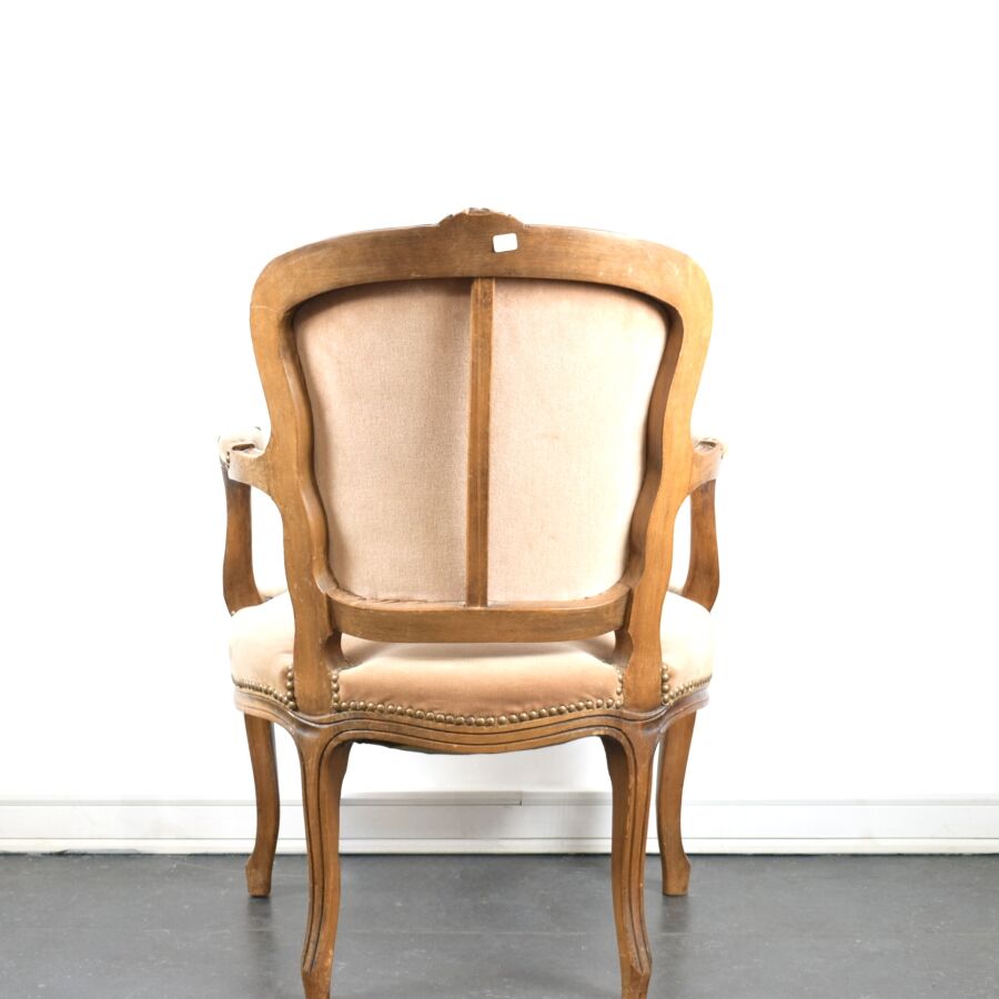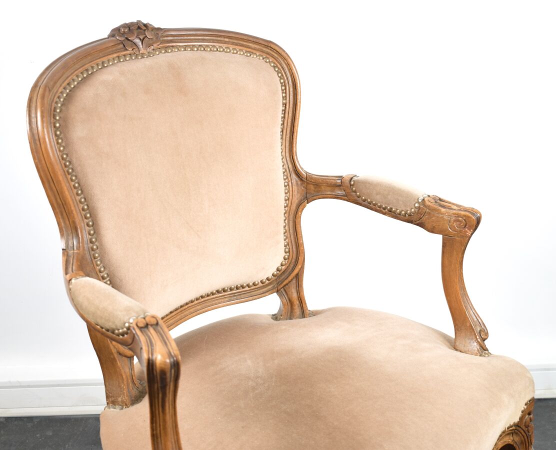 Fauteuil cabriolet style Louis XV en bois mouluré, garniture en velours rose, 76 x 53 cm. (taches sur la garniture, usures)