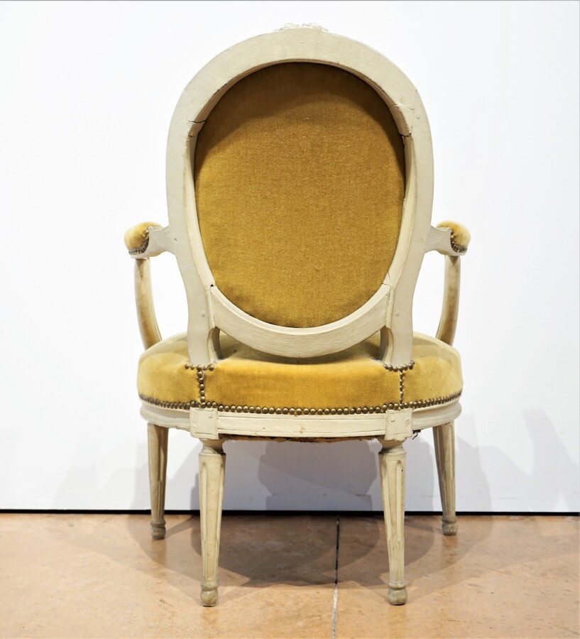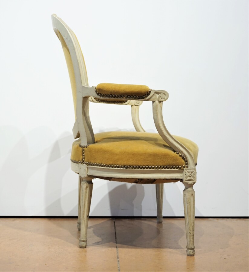 Fauteuil cabriolet style Louis XVI, dossier médaillon, garniture se velours jaune, montants laqués blanc, piétement cannelé et fuselé, H. 90 cm.