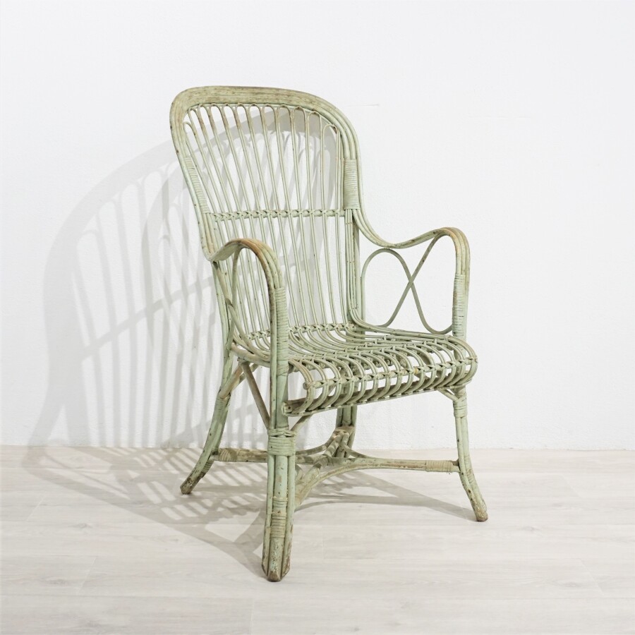 Fauteuil en rotin laqué vert d'eau, 50 x 45 x H. 99 cm (usures à la peinture, quelques trous de vers). * Provenance : Château Le Clausne